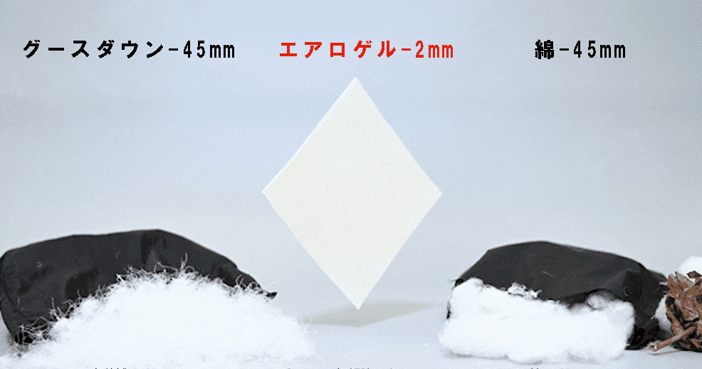 S.Kistler®エアロゲル素材の厚さは僅か2mmに対して、グースダウンやシンセティック合成繊維は同じ温かさを保つためには、一般的に45mmほど必要とされています。