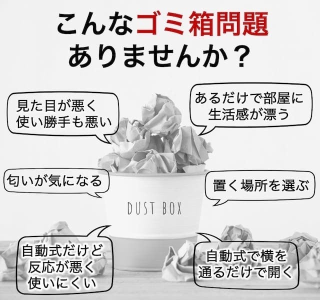 世の中にあるゴミ箱は基本的には見るからに生活感漂うゴミ箱や、自動式でもセンサーの反応がイマイチで使い勝手の悪いものが多く、私自身も電動式ゴミ箱を使用していましたが使い勝手の悪さから今は電源を切って手動で使用していたりします。