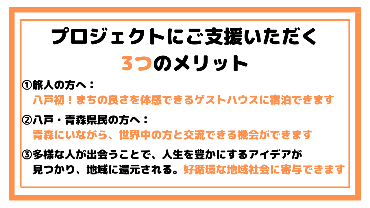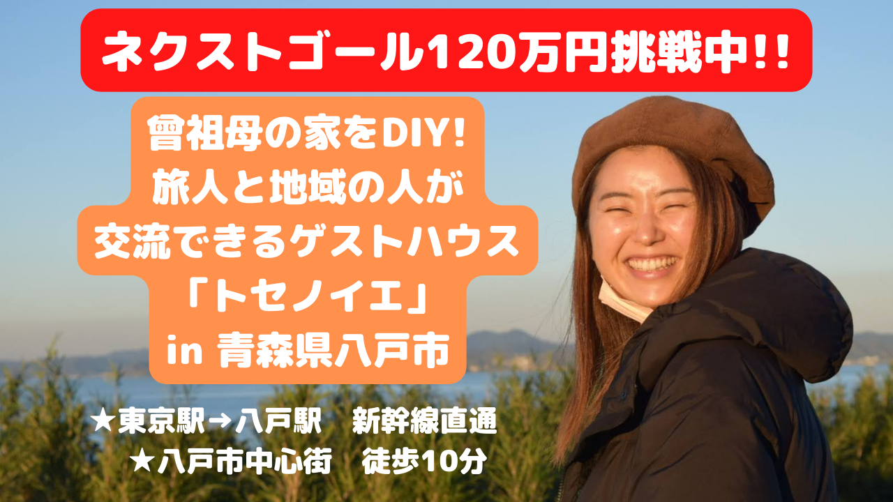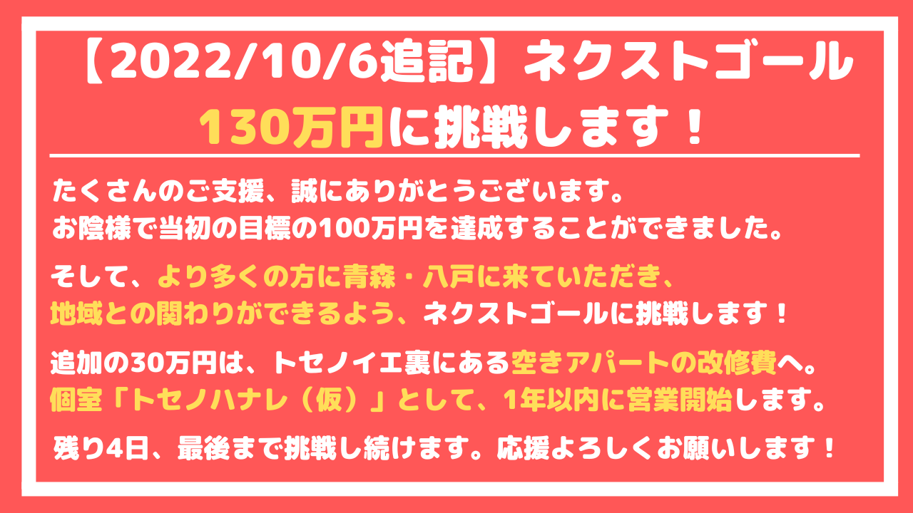 2022/10/09 11:18これまでたくさんのご支援、ありがとうございます。大変ありがたいことに、5日前に目標金額である100万円を達成することができました。私が想像していた以上に、たくさんの方にご支援をいただくことができ感謝感謝です。また、皆様の期待に応えられるよう、これからも精進していこうと気が引き締まりました。その後、ネクストゴールとして130万円を目指し、本日最終日を迎えました。追加の30万円のご支援をいただけた際には、トセノイエの裏にある空きアパートをDIYし、「トセノハナレ(仮)」として個室宿泊を受け入れるための資金にしたいと思っております。ありがたいことに、オープン前からご予約を頂いておりますが、トセノイエの定員は6名ですので、すぐに満室となってしまいます。「トセノハナレ」を作ることで、より多くの方に八戸の滞在を楽しんでいただき、八戸や青森の皆様と旅人との出会いを創出し、シナジーを生み出していきたいと思っております。ご支援いただけた皆様には、ぜひこの投稿をSNS等でシェアいただけますと幸いです。それ以外の方も、私の思いに賛同いただけた際には、ぜひ応援いただけますと嬉しいです。最後の最後まで、どうぞよろしくお願い致します!!! もっと見る