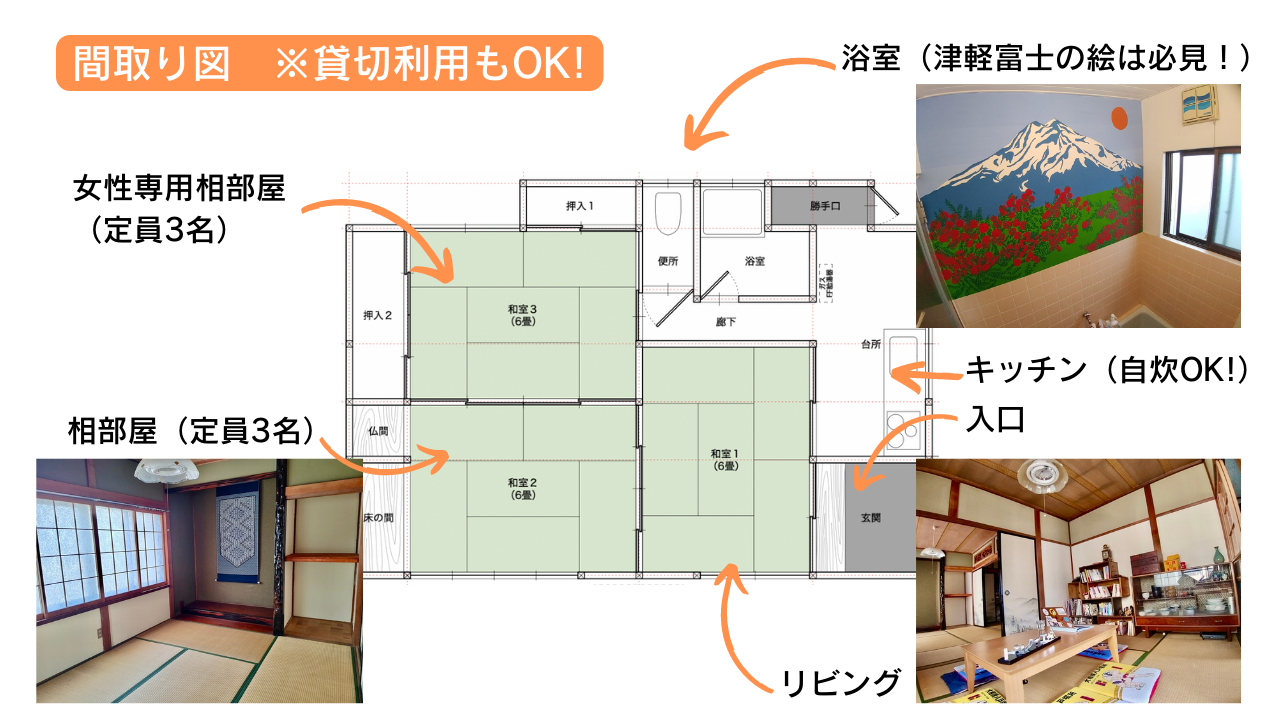 相部屋宿泊と、1棟貸切プランをご用意。