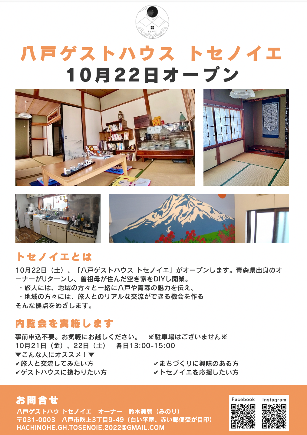 2022/10/13 16:36いつも応援ありがとうございます!トセノイエ オーナーの鈴木です。皆様のおかげで、クラウドファンディングの当初の目標を大きく上回り、130万円を超えるご支援をいただくことができました。本当にありがとうございます!!!!たくさんの応援いただいている方の存在を忘れず、引き続き前を向いて進んでいきたいと思っております。さて、今回は内覧会とグランドオープンのお知らせです。■内覧会 10/21, 22 各日13:00-15:00トセノイエをご自由にご見学いただけます。トセノイエを応援したい方、一緒にまちづくりをしたい方など、お気軽にお越しください。お話しましょう。なお、駐車場はございませんので、お手数ですが近隣駐車場をご利用ください。■10/22 グランドオープンオープン日には、2名の方にご宿泊いただける予定です!オープン記念と致しまして、オーナーの私が、せんべい汁をゲストさんへ振る舞う予定でございます。インスタグラム・Facebookで、グランドオープンの様子も更新させていただきますので、お見逃しなく!トセノイエにて、たくさんの方とお会いできることを心より楽しみにしております。よろしくお願い致します! もっと見る