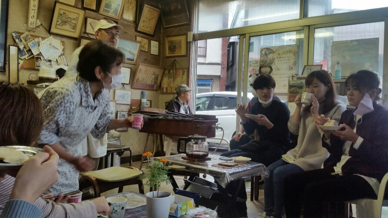 ゲストハウスの近くにあるせんべい喫茶へ。焼きたてのふわふわ煎餅をいただきながら、地域の方々とたくさんお話しました!