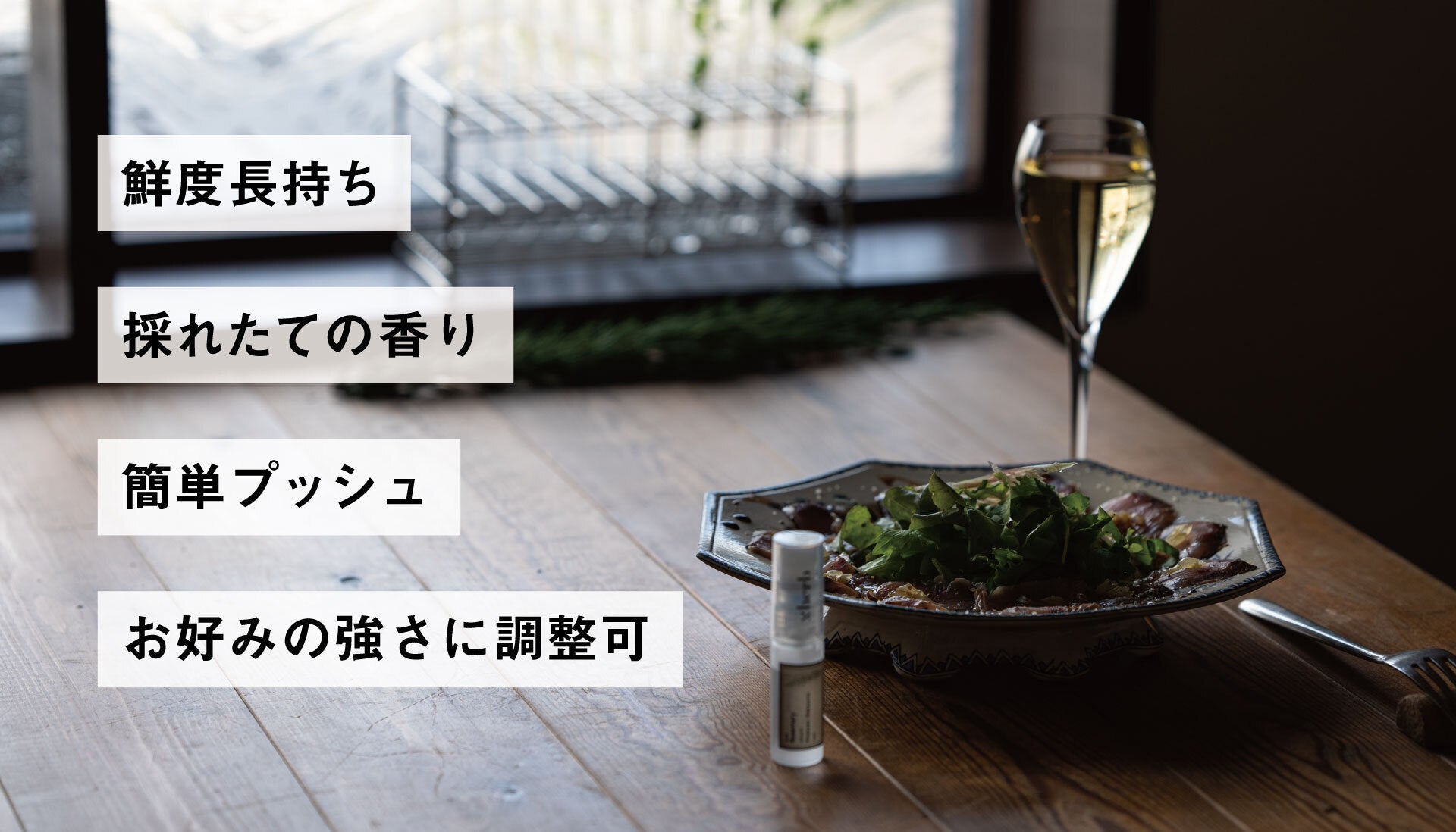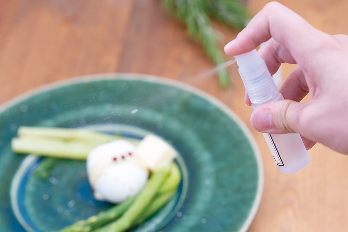 秘密は、ハーブの液体化。スプレーで吹きかけるだけで簡単に食べ物や飲み物に加えることができます。フレッシュハーブは数日で鮮度が落ちてしまうものですが、新商品は1ヶ月程度長くお使いいただけます。また、採れたてのフレッシュハーブの香りをお楽しみいただけます。香りの好みは人それぞれで、苦手な人もいますが、これなら自分の取り皿にだけハーブの香りを好きなだけ加えられます。