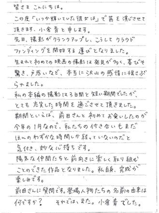 主演の小倉さんと監督の前田が交換日記を書きます!本作を応援していただいているみなさまに、映画の制作秘話を公開していきます。週に一度の頻度で更新予定です。 第一回は、小倉青さんの直筆コメントです。