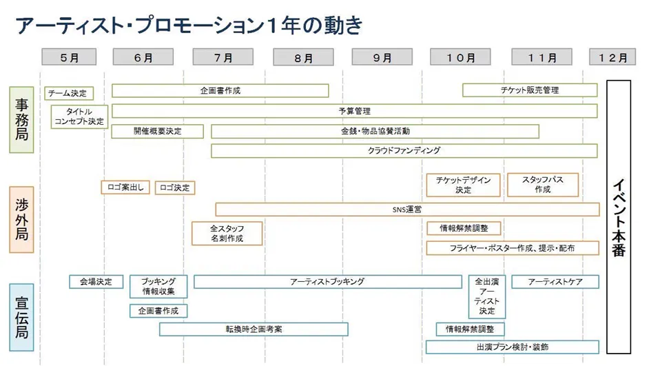 アーティスト・プロモーションとは、学生が0からイベントを作り上げる中で企画・運営力を養い、エンターテインメントについて学ぶ授業です。受講生は志望書を書き、選考を通過した熱意のある学生のみが履修しており、日々力を合わせております。