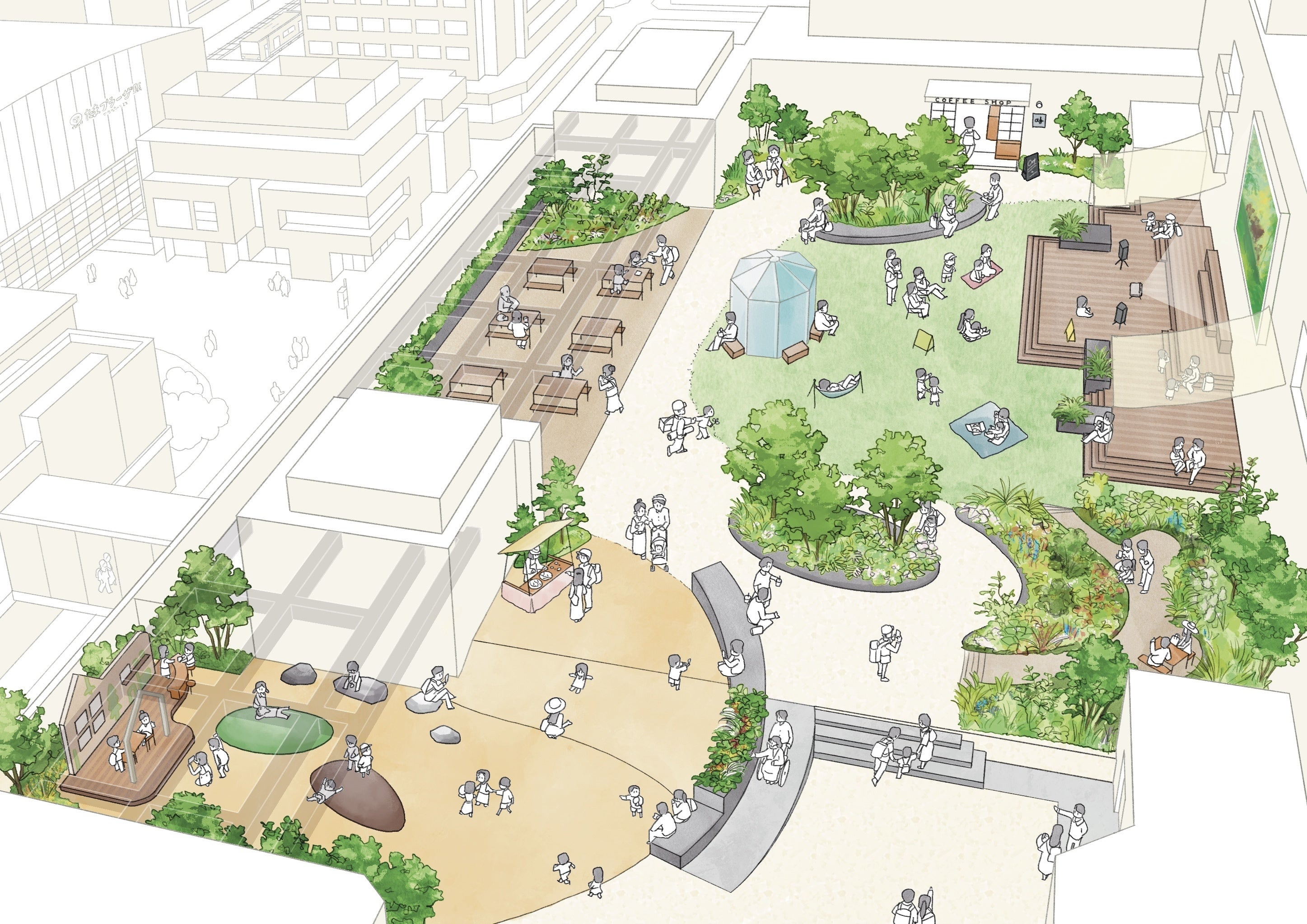 真ん中の大きなピクニックエリアを囲むように、子どものための広場やステージ、ダイニングなど、様々な要素が散りばめられています。