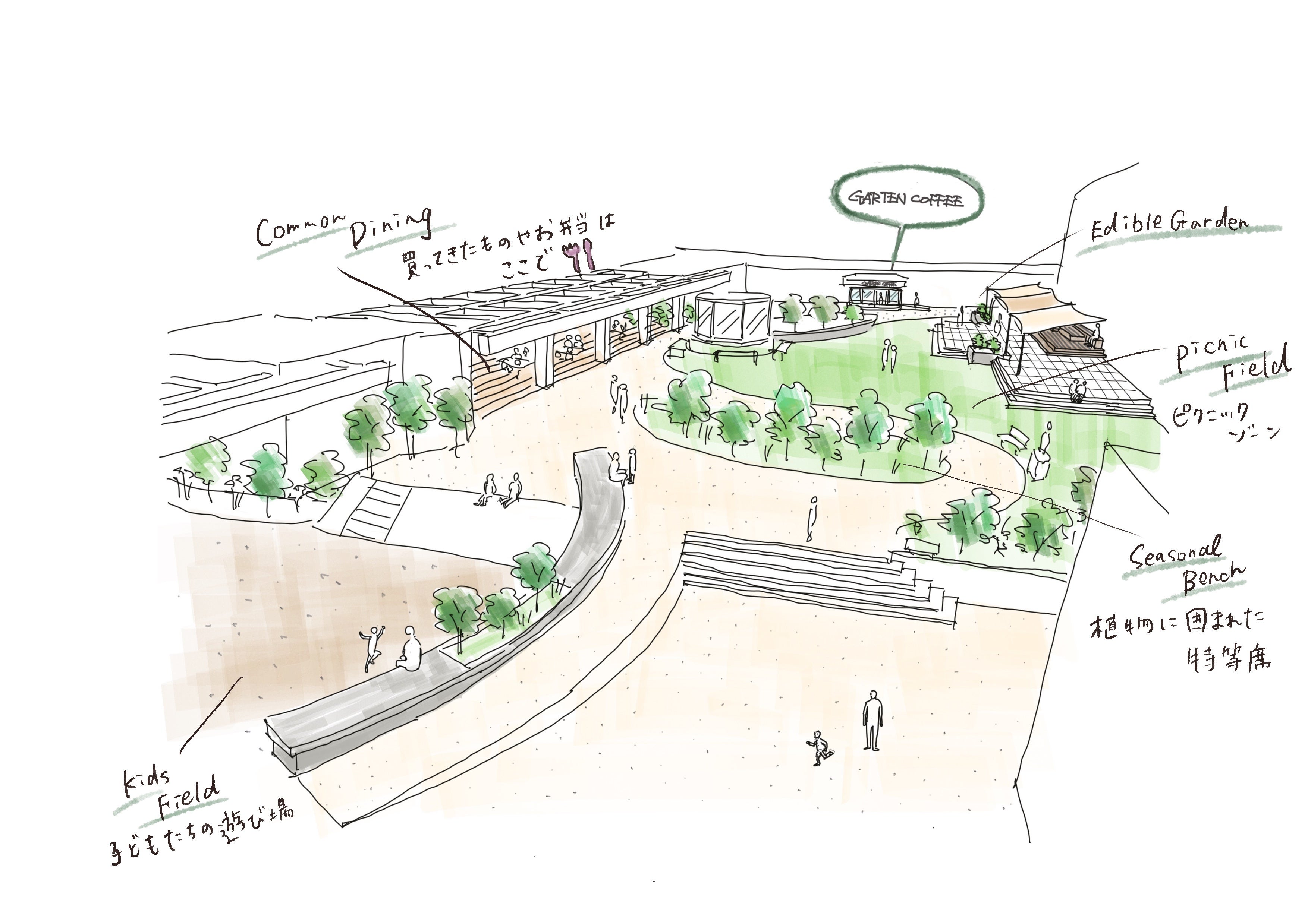 真ん中の大きなピクニックエリアを囲むように、子どものための広場やステージ、ダイニングなど、様々な要素が散りばめられています。