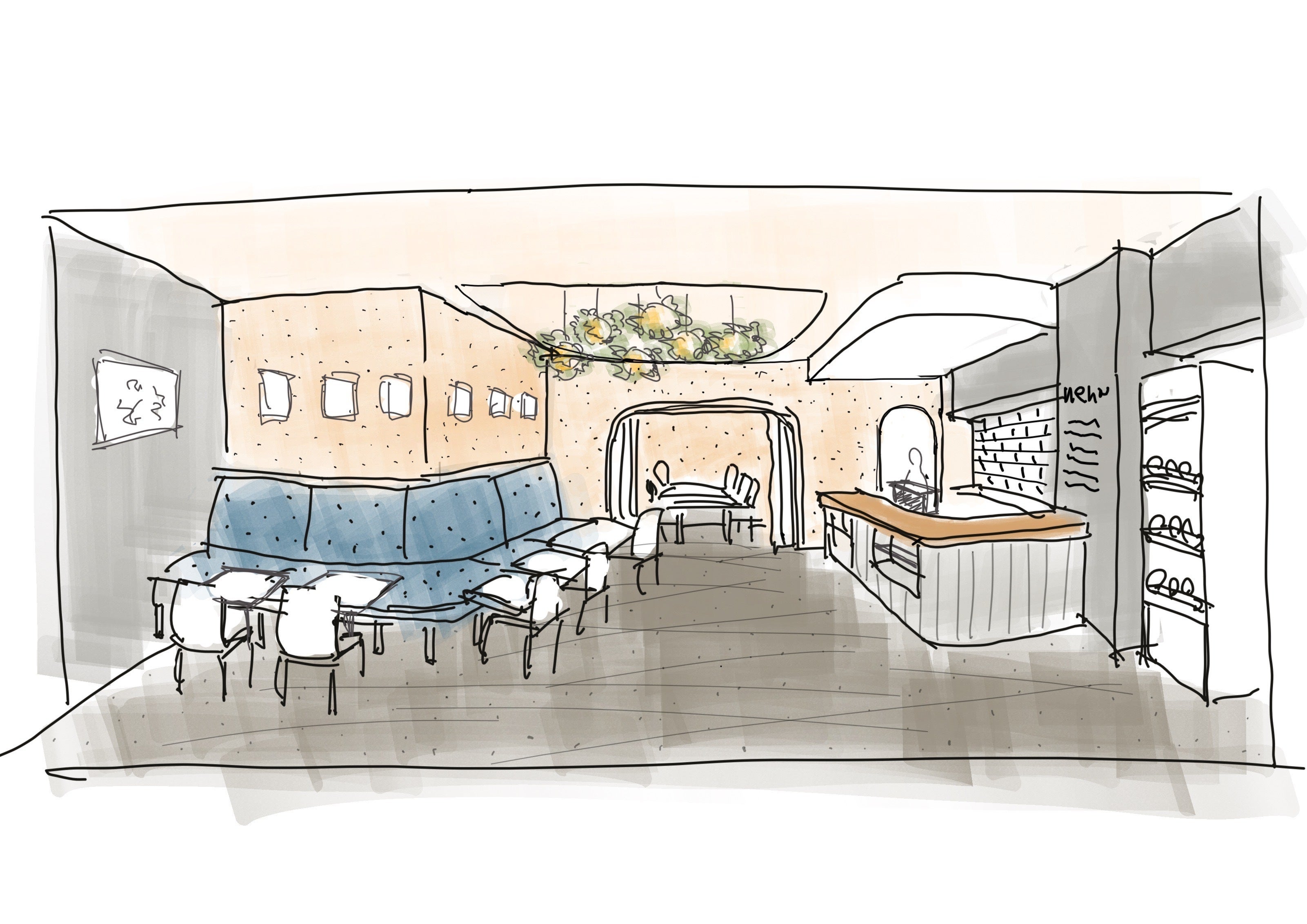 ▲今回計画しているテナントの店内スケッチ。たまプラーザが位置している、青葉区の“区の木“がヤマザクラとのことで、隠れたイメージカラーをヴィンテージピンクにして進めています…!ドキドキ