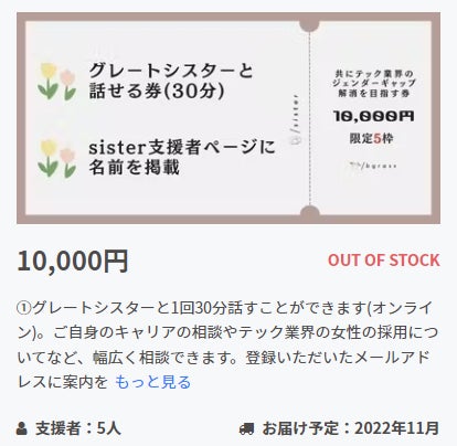 少し前になりますが、10,000円グレートシスターと話せる券付きリターンが完売しました!!!想像以上に早く完売して、嬉しく思っています。