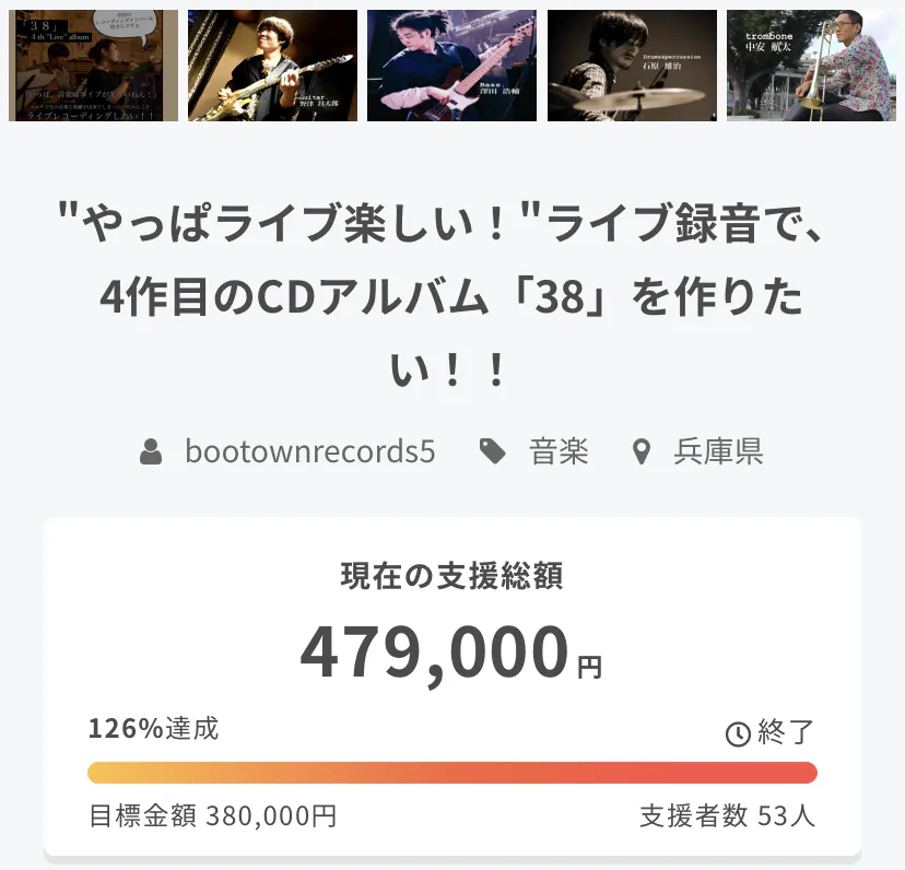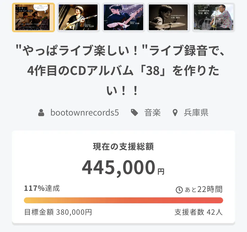 2022/09/30 08:00ご覧くださりありがとうございます!まずは、ここまで応援してくださった皆様本当にありがとうございます。いよいよ、最終日になりました!当初の目標を大きく上回り、現在117%、445,000円のご支援をいただいています。100%を超えた支援金については、ライブを経験したことのない学生さんやミュージシャンを志す若者たちが、ステージで演奏できる、ライブイベントの開催に使わせていただきます。残り22時間、最後までよろしくお願いします! もっと見る