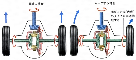 どの車も、左右曲がるために生じる左右車輪の距離の差を吸収するためにデフ(差動装置)というものが付いています。前輪駆動ならば前輪車軸の左右間。後輪駆動ならば後輪車軸の左右間。4WDならば前後左右車軸間と前後連結車軸の間(フルタイム4WDのみ)に装着されています。
