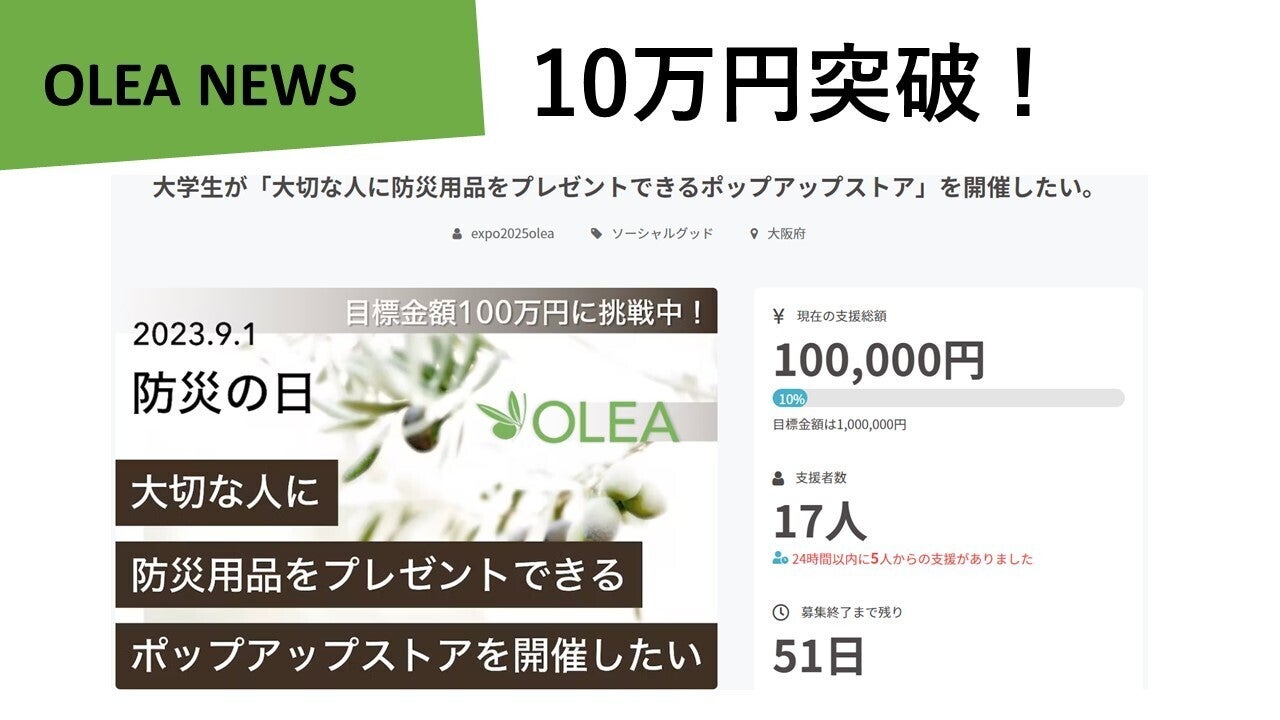 こんにちは、OLEAの匠です。先日、支援金額が10万円を突破いたしました!ご支援いただいた皆様のおかげです。誠にありがとうございます。目標金額100万円の達成に向けてさらなるみなさまのご支援が必要になります。どうか応援のほどよろしくお願いいたします。クラウドファンディングの詳細はこちらから