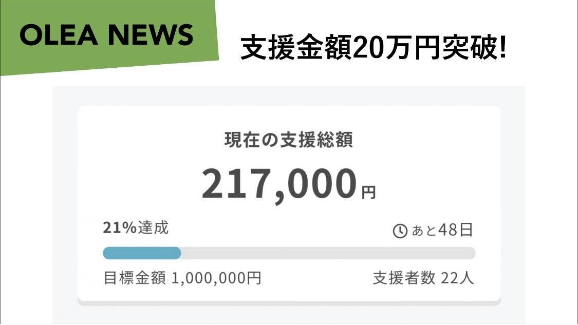 皆さんこんにちは。OLEAの藤井です。クラウドファンディングスタートから4日目に、ご支援金額20万円を突破いたしました!!20%達成です!パチパチOLEAを応援してくださる皆様に心より感謝申し上げます。100万円の目標達成に向けてまだまだ頑張ってまいりますので、ぜひご支援のほどよろしくお願いいたします!クラファンページはこちらから!