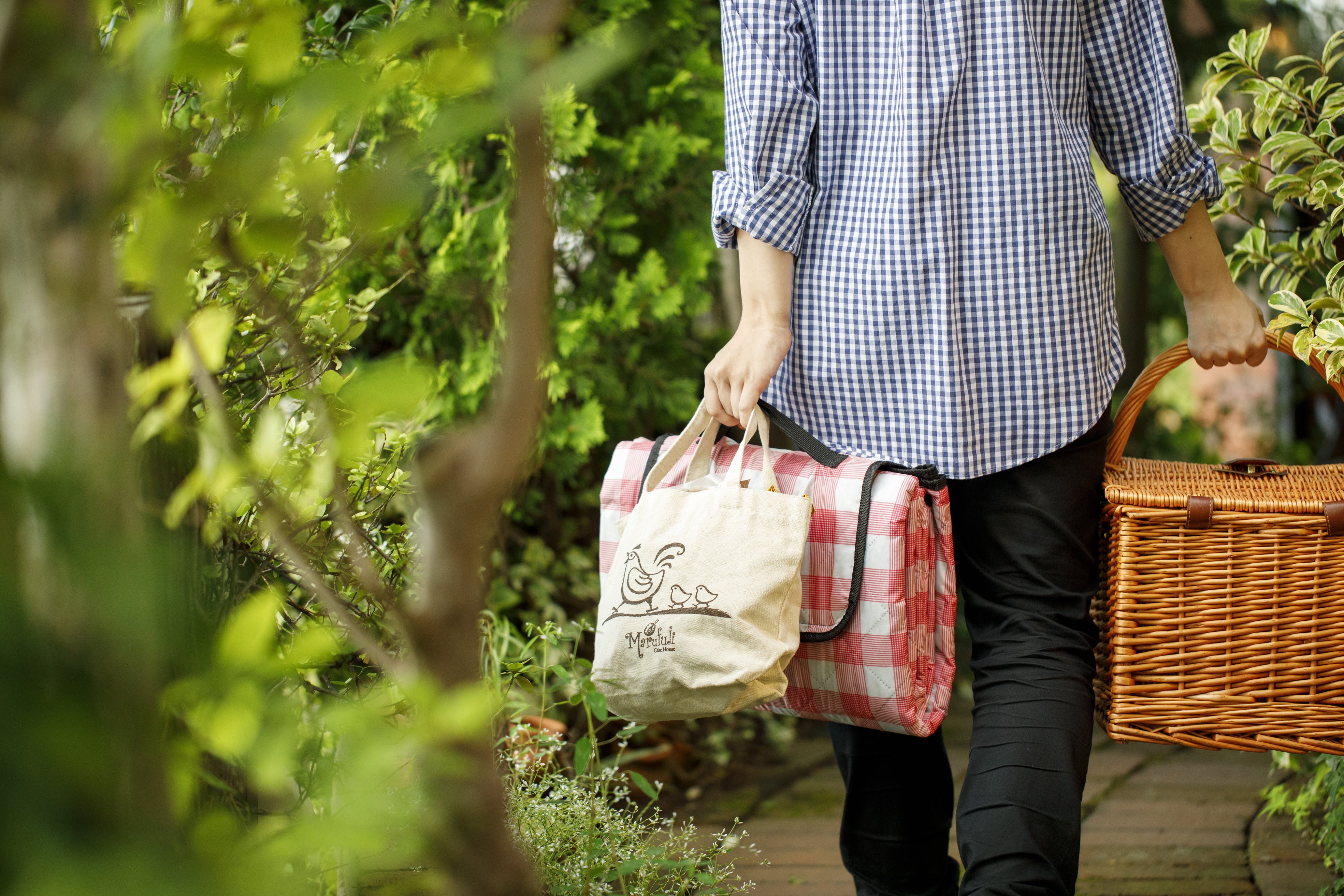 親はこどもを眺めながら、バスケットとブルーシートを持ってピクニック気分。