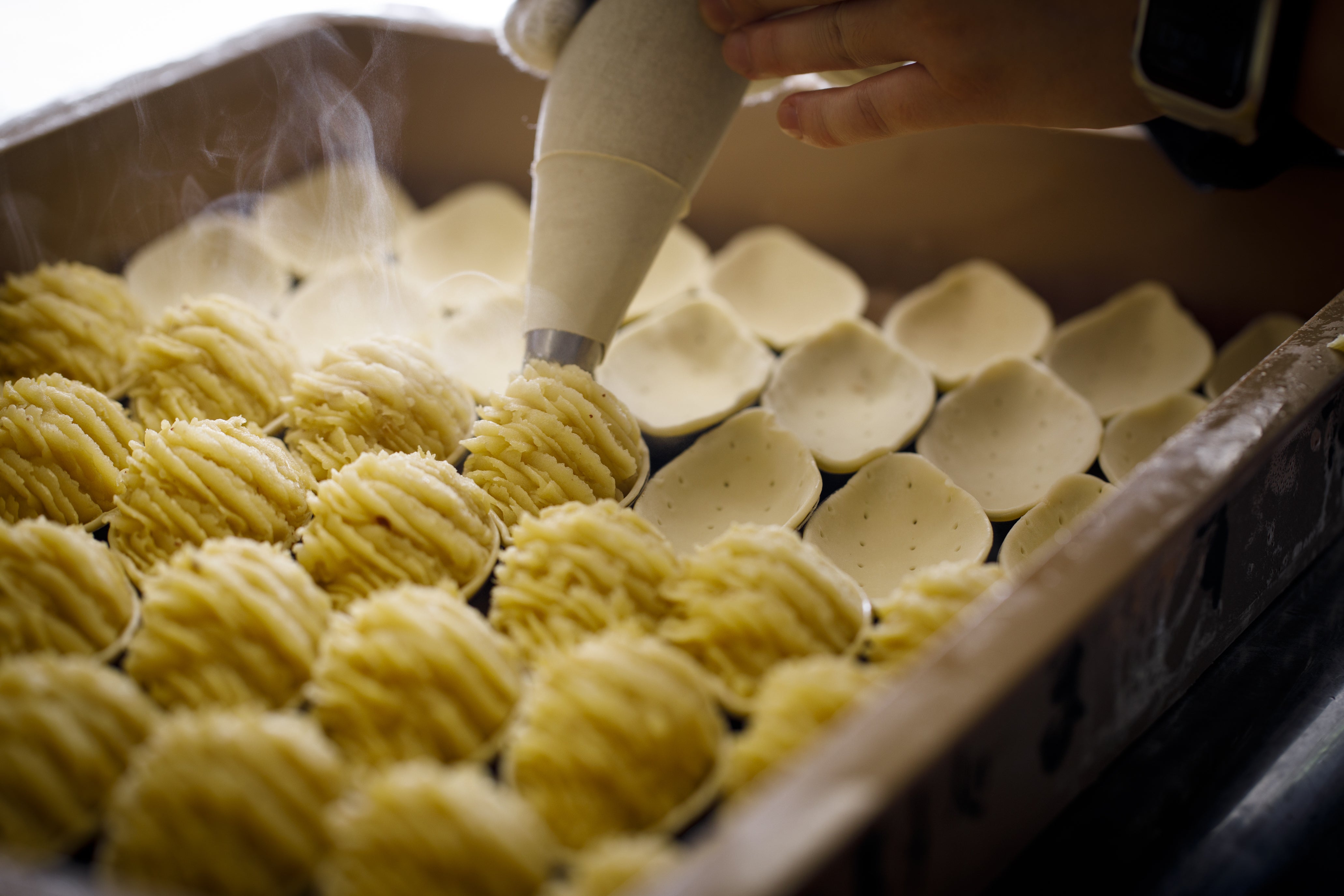 裏ごしした五郎島金時にバター、卵黄、たっぷりの生乳を加えてじっくりと練って炊き上げます