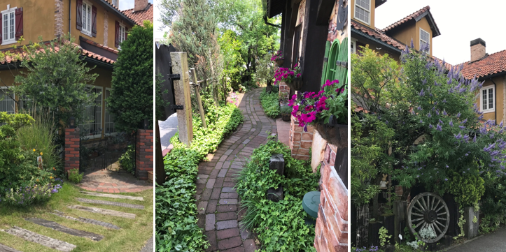 庭にガゼボとパーゴラ、ガゼボの中は切り株のイスとテーブル。子どもたちだけの世界