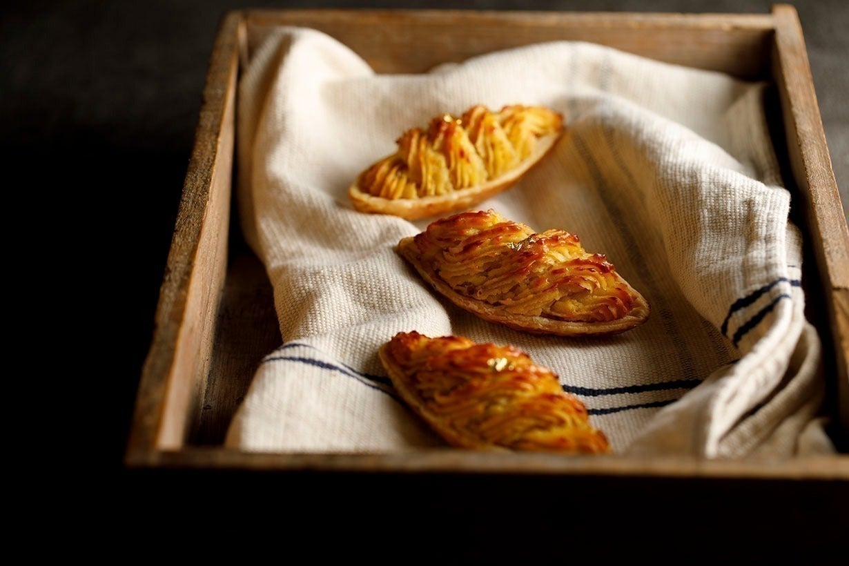 ひとくち頬張ると故郷を思わせるあたたかい味わいとこぼこぼとした食感。金箔のかざりが美しいスイートポテトです。