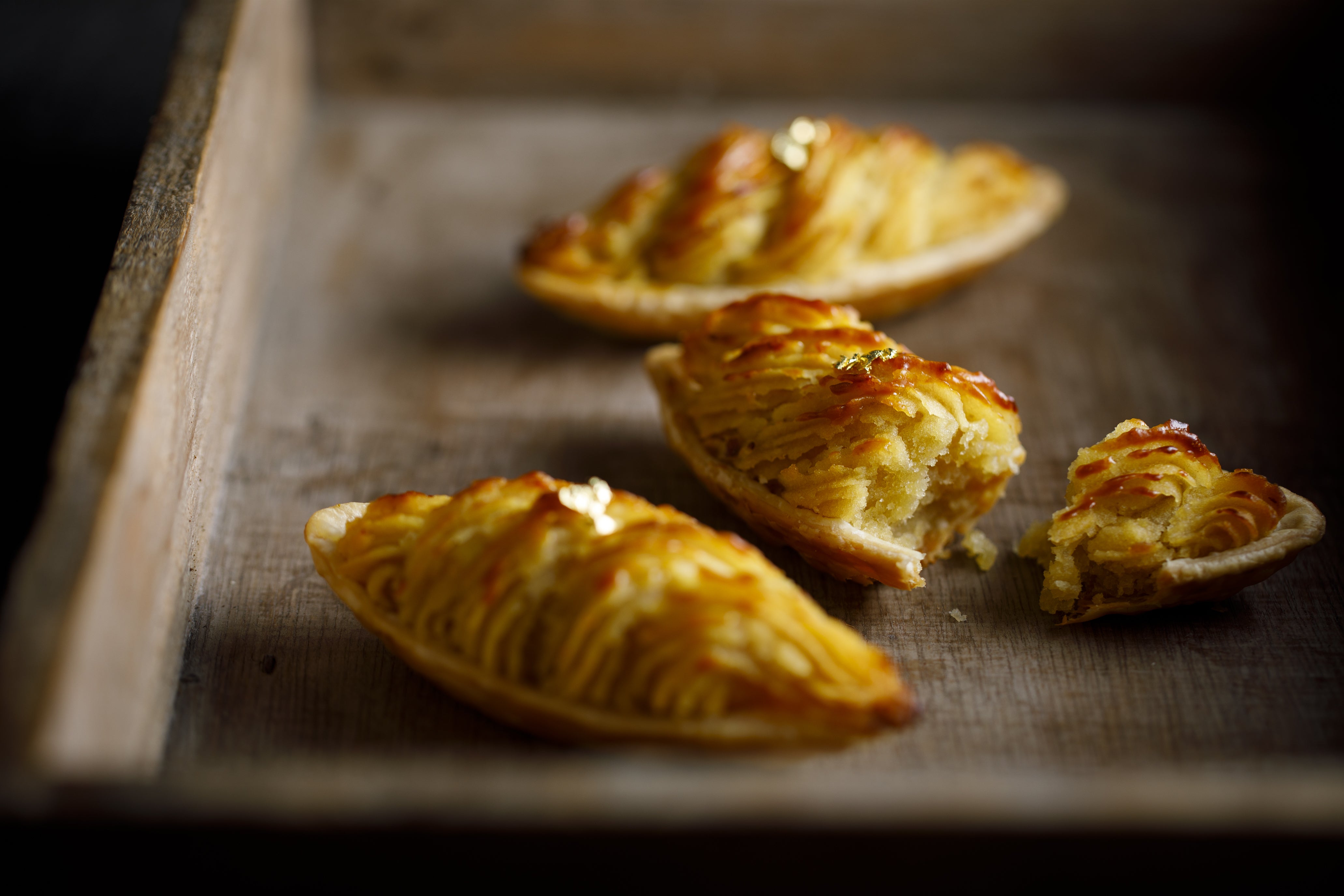 ひとくち頬張ると故郷を思わせるあたたかい味わいとこぼこぼとした食感。金箔のかざりが美しいスイートポテトです。