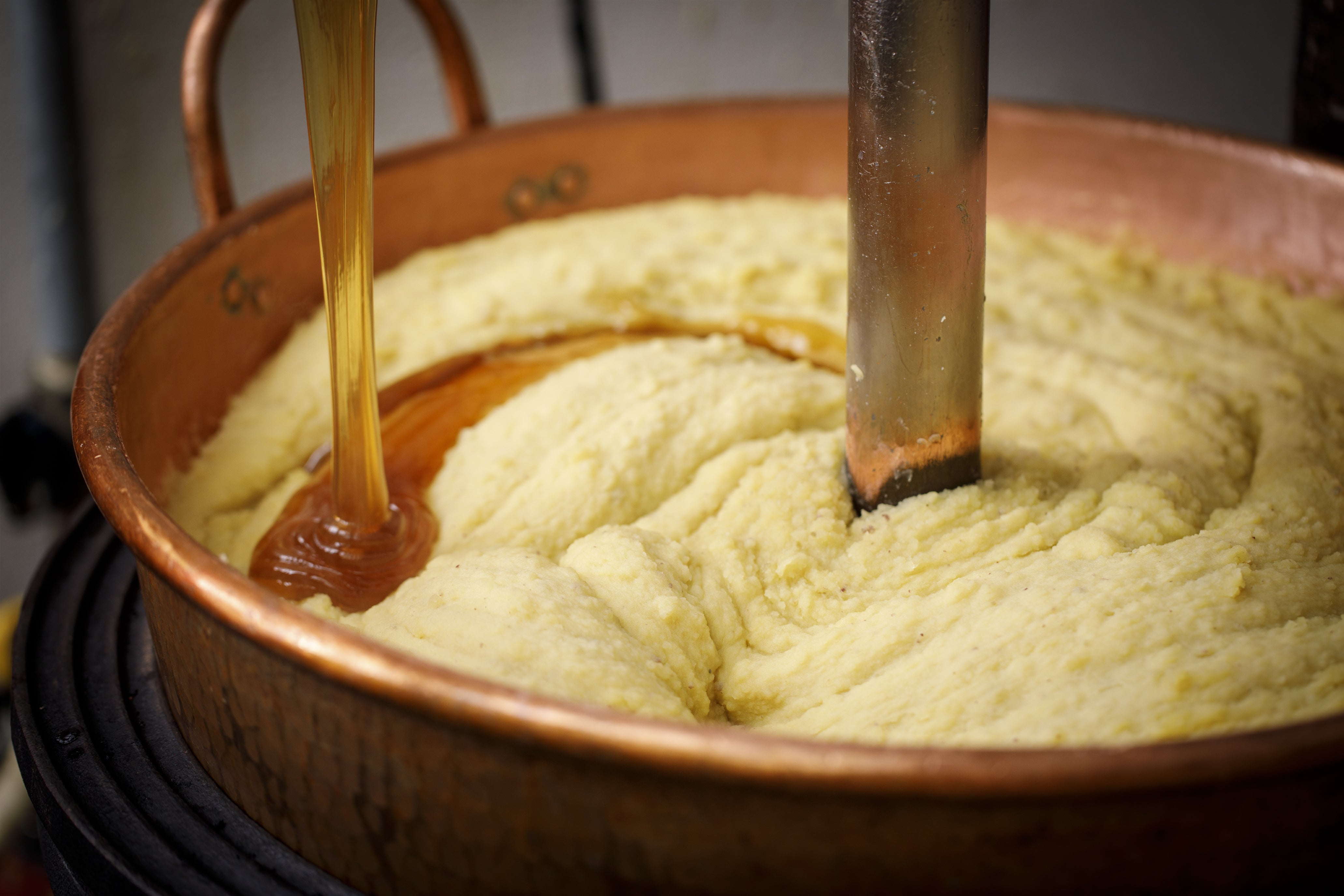 まろやかさとコクをを出すためにもち米飴を加えます。大切なのは練り上げと火力の加減