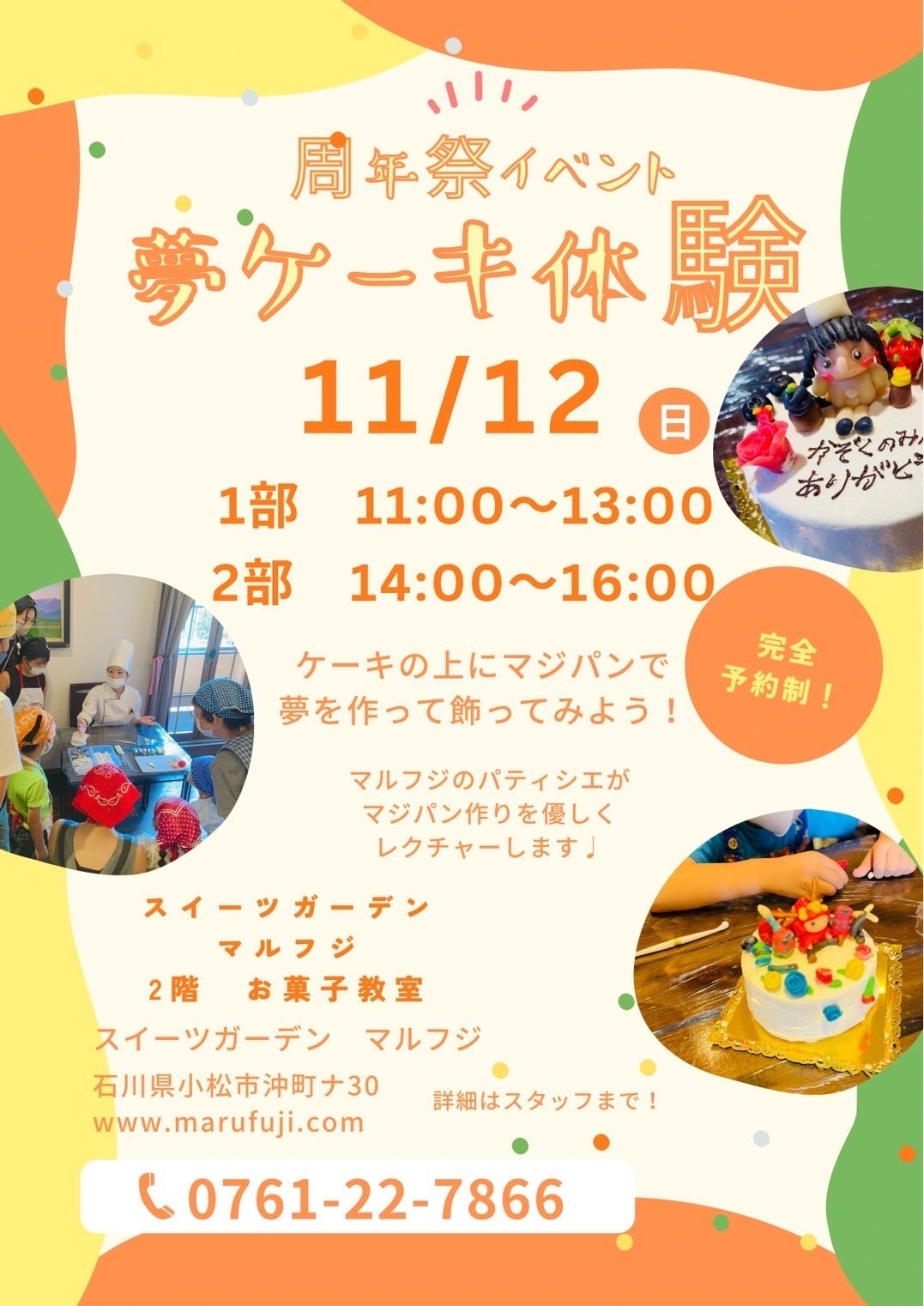 2023/10/19 09:48皆様ご無沙汰しております。クラウドファンディングに挑戦しはや1年。。。沢山のご支援のおかげでスイーツガーデンマルフジとして来月で1周年を迎えます!!そしていよいよ第一回夢ケーキの開催が決定しました。日時:11月12日(日)時間:11:00~13:00 14:00~16:00初めての実施になりますので、まずはご支援頂いた皆様から優先でご招待できればと思います。ぜひ参加したいという方おりましたら、気軽にお電話ください。引き続きよろしくお願い致します。 もっと見る皆様のおかげでグランドオープンできました!