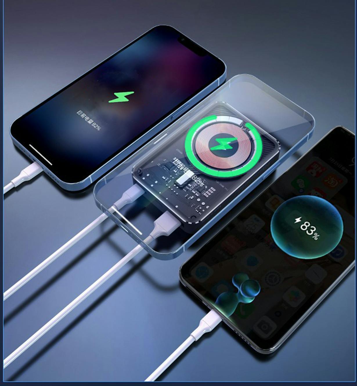 10000mAh:ワイヤレス+TYPE-C+USB-A、最大3台のデバイスを同時充電できます。