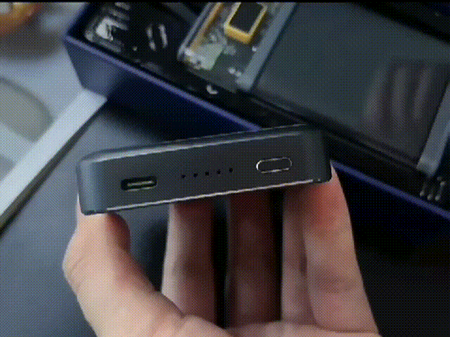 A:透明であり強度なガラス+金属ケース、マグネット吸着充電、小型ワイヤレスパワーバンクです。