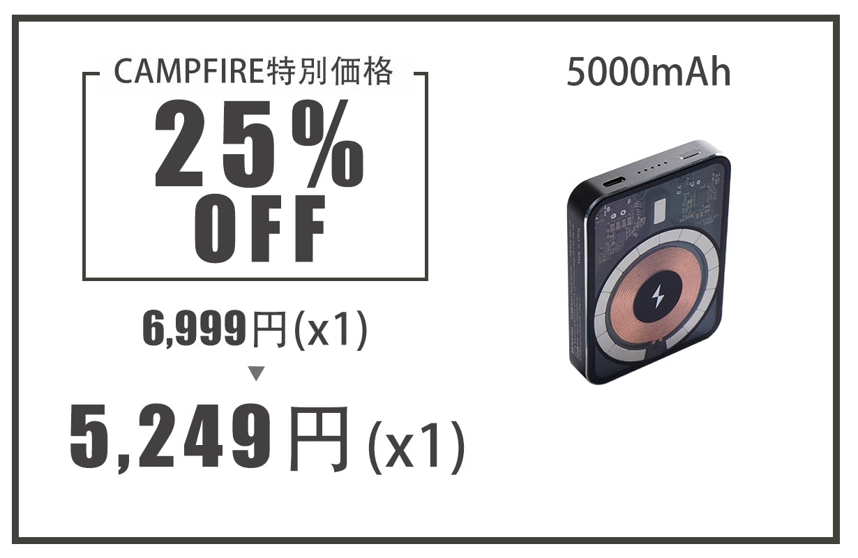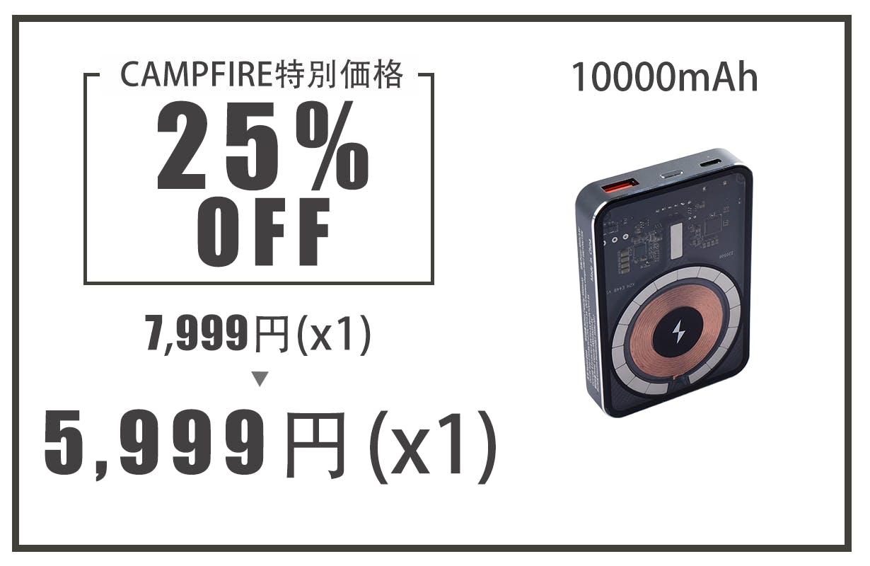 2022/12/08 20:36ご支援いただきました皆様へお陰さまで商品の生産が予定の通りに生産を完了し、日本に発送しました。現在には、日本側の税関で通関手続きを行う最中になります。関連の手続きが完了後に、サポーター皆さまの手元へ順次に発送を開始いたします。予定として、12月10日後に発送する予定です。ご住所、受取人情報が変われる場合には、事前に教えていただくようお願い申し上げます。みなさまのご期待とご支援をいただきましたことに弊社一同、大変感謝しております。随時、進捗を活動報告の形で報告いたします。次には、弊社はCAMPFIREで新商品を掲載したことをご報告いたします。現在公開中のURLhttps://camp-fire.jp/projects/view/633403掲載中の商品:[コンセント付きAC最大100W・DC最大65W出力飛行機に乗れるポータブル電源]❶日米電圧対応、AC100W出力が1台に充電でき、DC65W出力が3台に充電できます。➋27000mAhの電池容量で、飛行機に持込できます、出張時の応急電源として使えます。➌アウトドアや災時にノートパソコンや電話など移動端末にAC/DC出力で充電できます。関連情報:❶ 出 力:AC/DCの出力あり、外出時にパソコン、カメラなど端末にすぐ充電できる➋ 容 量:100W未満、27027mAh以下、飛行機の乗れる範囲にに抑えたい➌ サイズ:薄型タイプで、カバンに収まりやすい、持ち運びしやすいサイズ➍ 重 量:できる範囲の中で軽くして欲しい、片手で持ち歩ける ご興味がありましたら、是非新商品ページで詳細内容をご確認してください。ご意見やご質問などがございましたら、弊社宛にご連絡をいただくようお願い致します。みなさまからのご応援をお待ちしております。引き続きよろしくお願い申し上げます。TWY株式会社 透明式マグネットワイヤレスパワーバンクチームポータブル電源チーム もっと見る