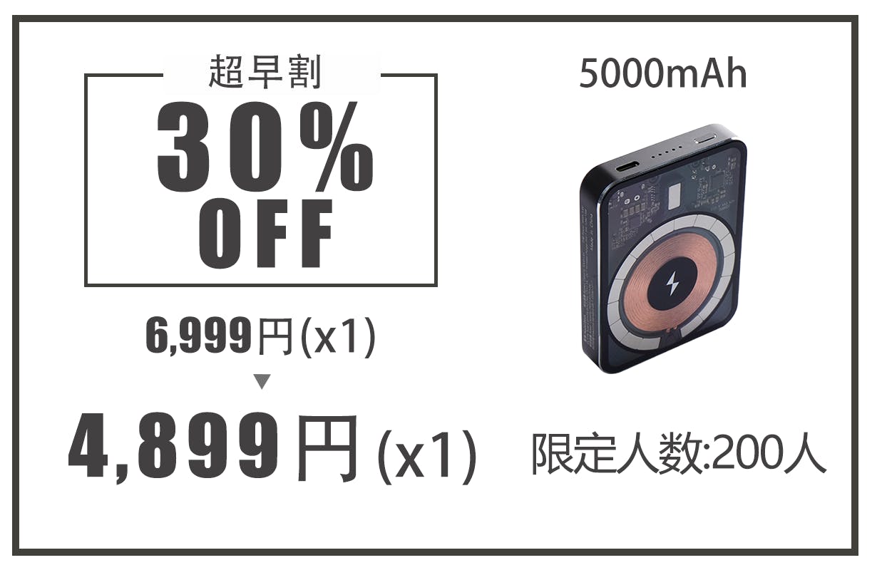 A:5000mAhと10000mAhの二種類容量で、ワイヤレス充電最大15W/有線充電22.5Wまで出力できます。