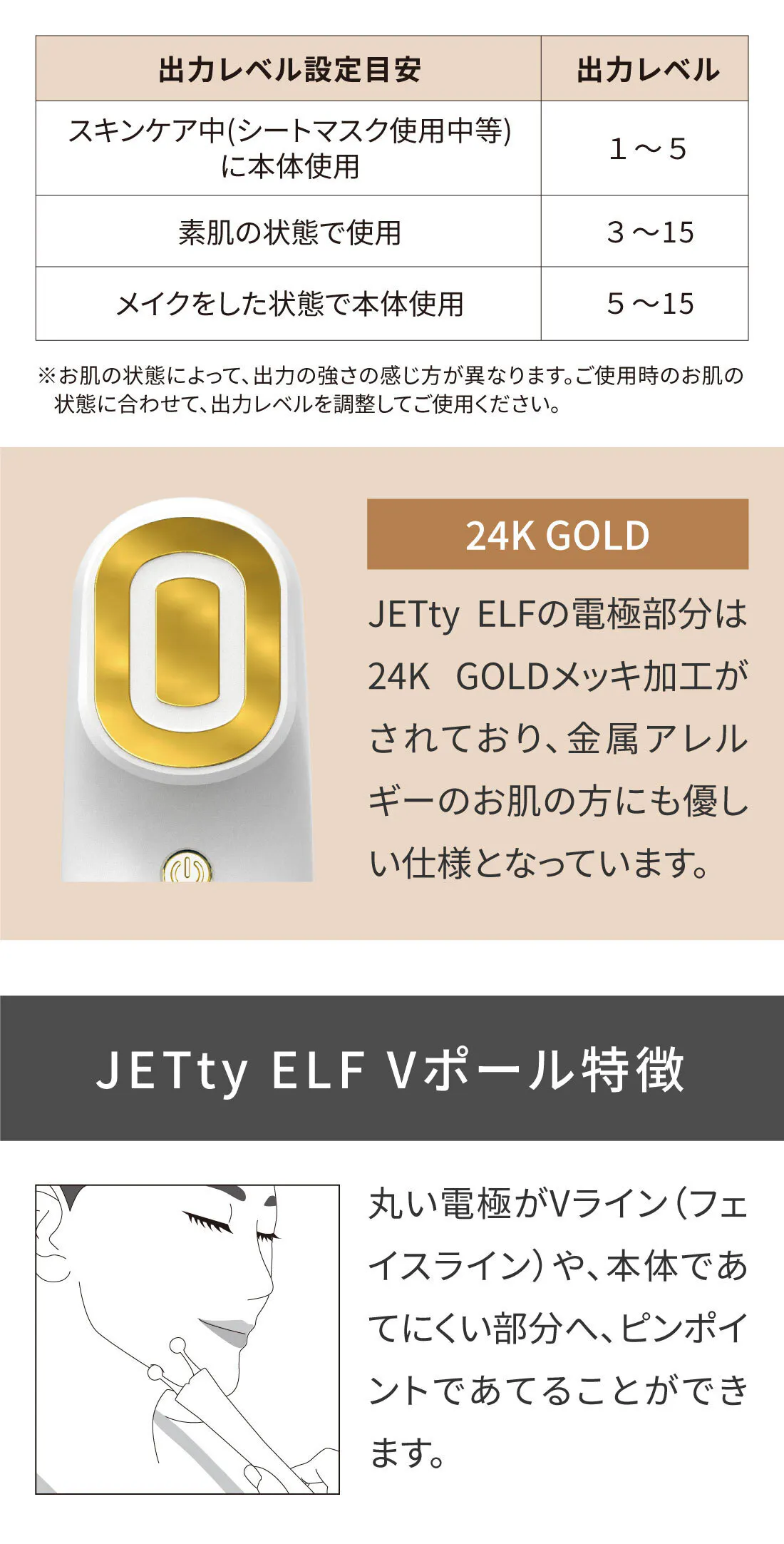 3.モード選択後、ヘッド部を肌にあて、肌の状態に合わせ出力レベルを調整します。