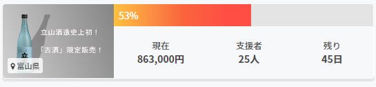 2022/09/09 09:332022/9/9 投稿昨日8日正午より開始しました当プロジェクト、沢山の温かい支援をくださった皆様のおかげで早くも目標金額の50%以上を達成いたしました。まさかこんなに早くご支援いただけるとは思っておらず、プロジェクト担当も驚いていると同時に、皆様にしっかりとお応えしなければと改めて気を引き締めた次第です。心よりお礼申し上げます。本当にありがとうございます!!現在リターン枠は・ご支援額¥12,500 無濾過大吟醸愛山3年古酒 720㎖(定価¥13,750)×1本・ご支援額¥25,000 無濾過大吟醸愛山3年古酒 720㎖(定価¥13,750)×2本・ご支援額¥25,000 無濾過大吟醸愛山3年古酒 1800㎖(定価¥27,500)×1本の3つ空きがございます。目標金額達成までやり遂げられればと思いますので、どうぞよろしくお願いいたします!! もっと見る