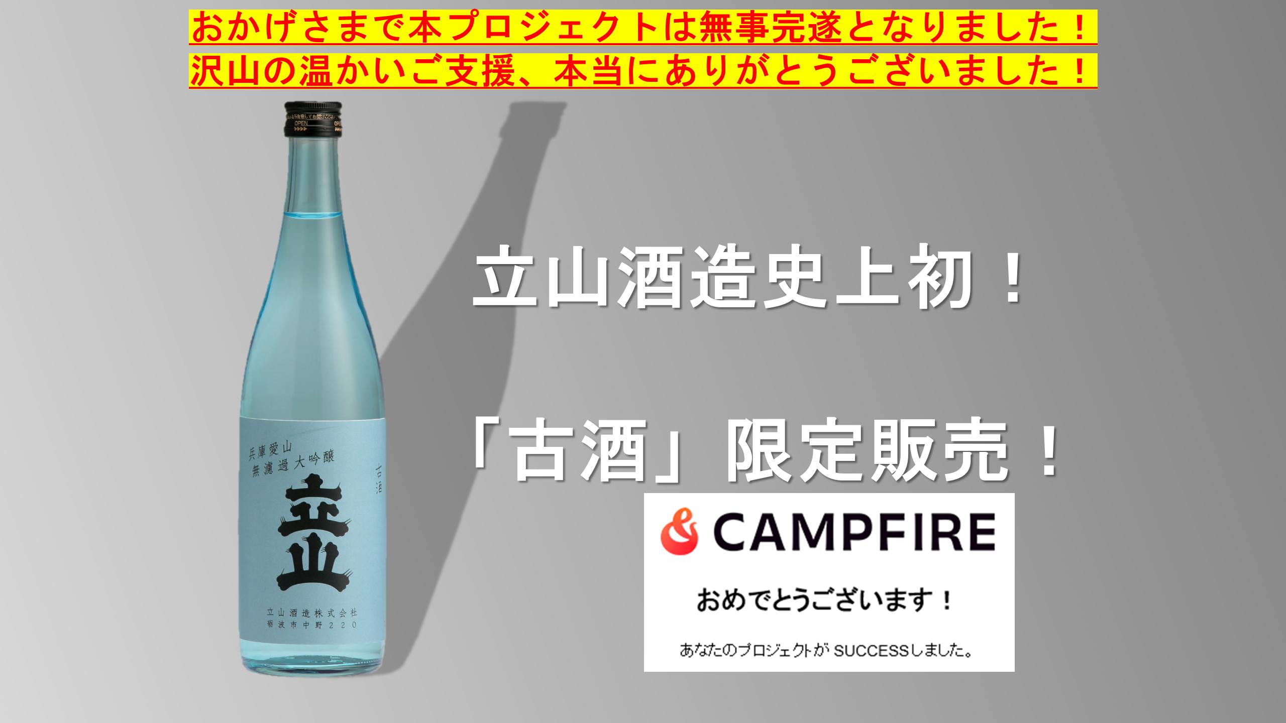 2022/09/21 16:012022/9/21 投稿改めまして、今回は弊社初のクラウドファンディング、そして古酒プロジェクト【立山酒造史上初の古酒!】無濾過大吟醸愛山3年古酒を限定販売します!に沢山の温かいご支援をいただきまして、誠にありがとうございます。無事に目標金額を達成でき、社員一同、感謝の気持ちでいっぱいです。これも日頃より立山のお酒を愛してくださっている皆様のおかげです!今後の更なる酒質向上、そして更に美味しくなった立山のお酒で皆様に恩返しできればと思います。リターン品につきましては、現在準備を行っております。後日、CAMPFIREのメッセージ、またご支援いただいた皆様のメールアドレス宛にお知らせをお送りいたしますので、届きましたらご確認いただければ幸いです。最後に、ご支援していただいた皆様、本プロジェクトを応援していただいた皆様、宣伝をお手伝いいただいた皆様、プロジェクト実施にあたり助力していただいたCAMPFIREの担当者様に心よりお礼を申し上げます。本当にありがとうございました。皆様のご多幸を心よりお祈りいたします。立山酒造株式会社 CAMPFIRE プロジェクト「【立山酒造史上初の古酒!】無濾過大吟醸愛山3年古酒を限定販売します!」担当 もっと見る
