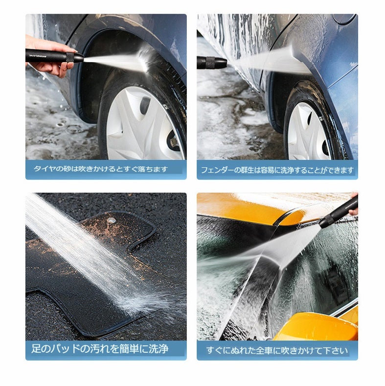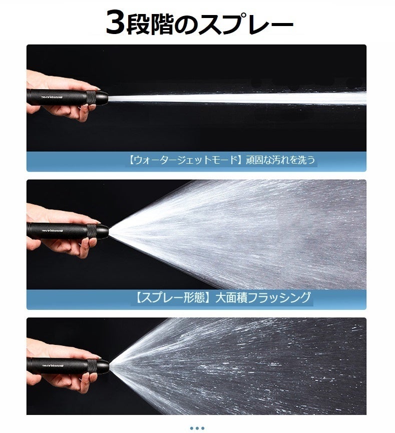 ノズルを回すだけでスプレモードを調整可能です。車を洗う、窓を洗う床を洗う、庭に水 をやるなども自由に調整できます。