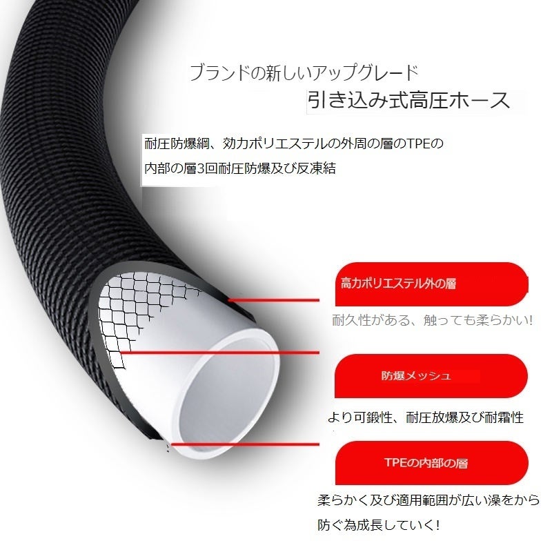 ホースの外層は高弾力性のある高品質な布でできて、改良されたPVC材質のホースは引き伸ばしても破損しにくくなっています。冬でもホースが硬くならない。