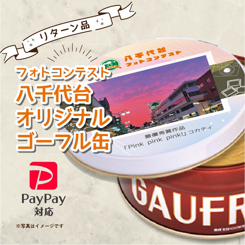 八千代台フォトコンテストオリジナルパッケージ「ゴーフル」今年の最優秀作品を蓋部分に印刷したオリジナル缶を使用。中身はミニゴーフル6枚。バニラ、ストロベリー、チョコレート3枚1組、2袋。毎年食べ物系の商品を探しており、昨年はさくまドロップでした。今年は食べた後の空き缶も長く使用できる事から丸い形のゴーフルを採用。食べた後もぜひ物入れとしてお使い下さい。
