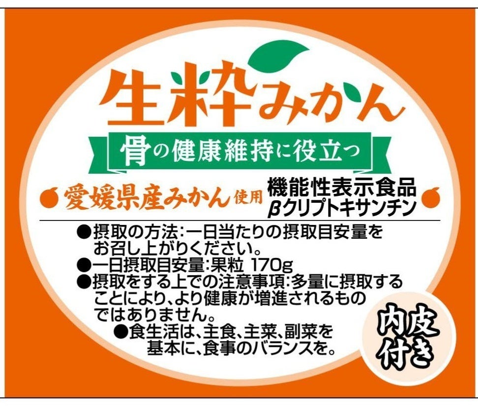 栄養成分表示(一日摂取目安量(170g)あたり):エネルギー83kcal たんぱく質0.9g 脂質0.2g 炭水化物20g 食塩相当量0.01g 機能性関与成分 βクリプトキサンチン 3mg