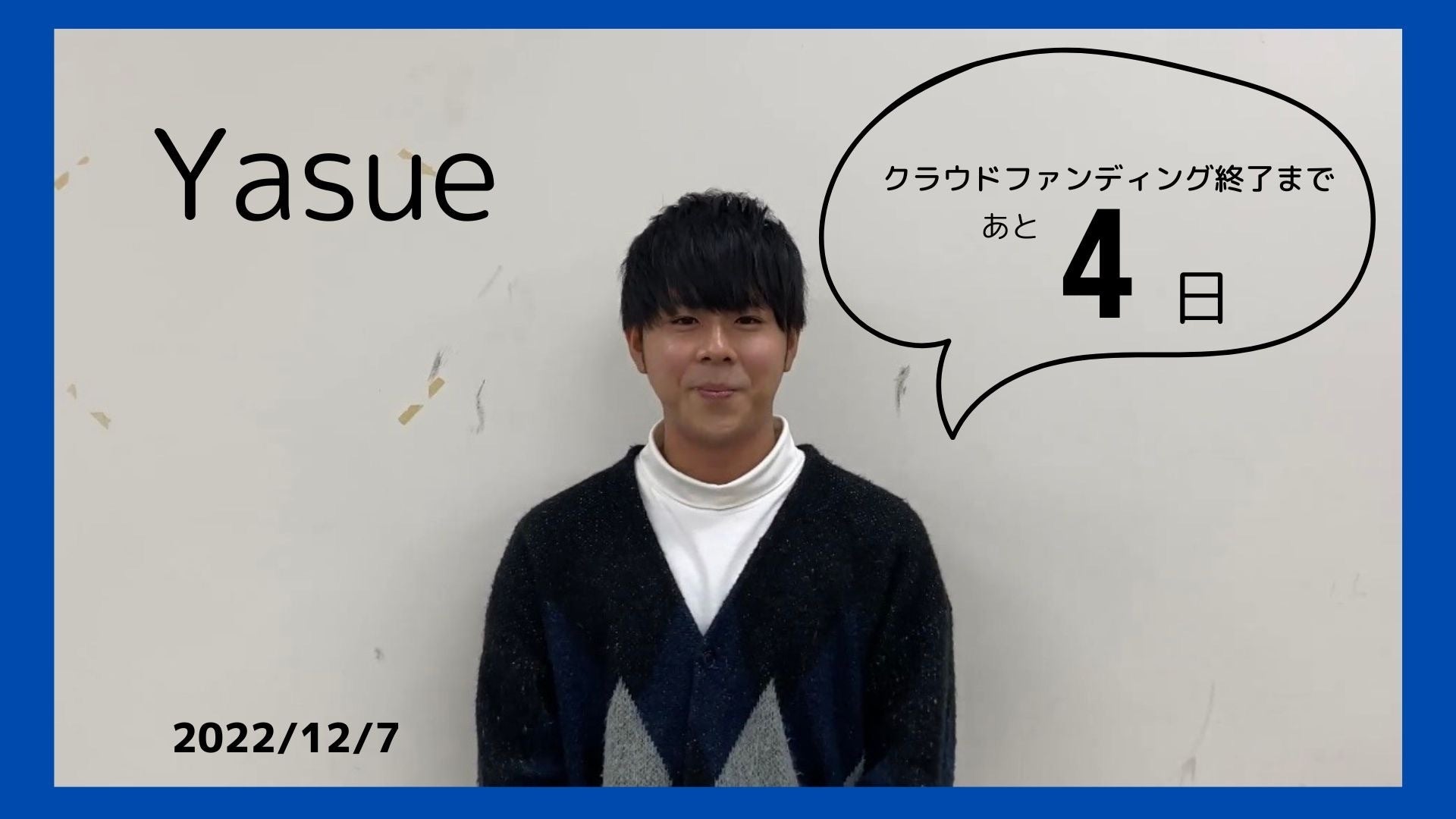 こんにちは!代表の辻です。本日はゼミ生の”Yasue”です。ぜひご覧ください。クラウドファンディングは残り約15%です!皆様のご支援よろしくお願いいたします!