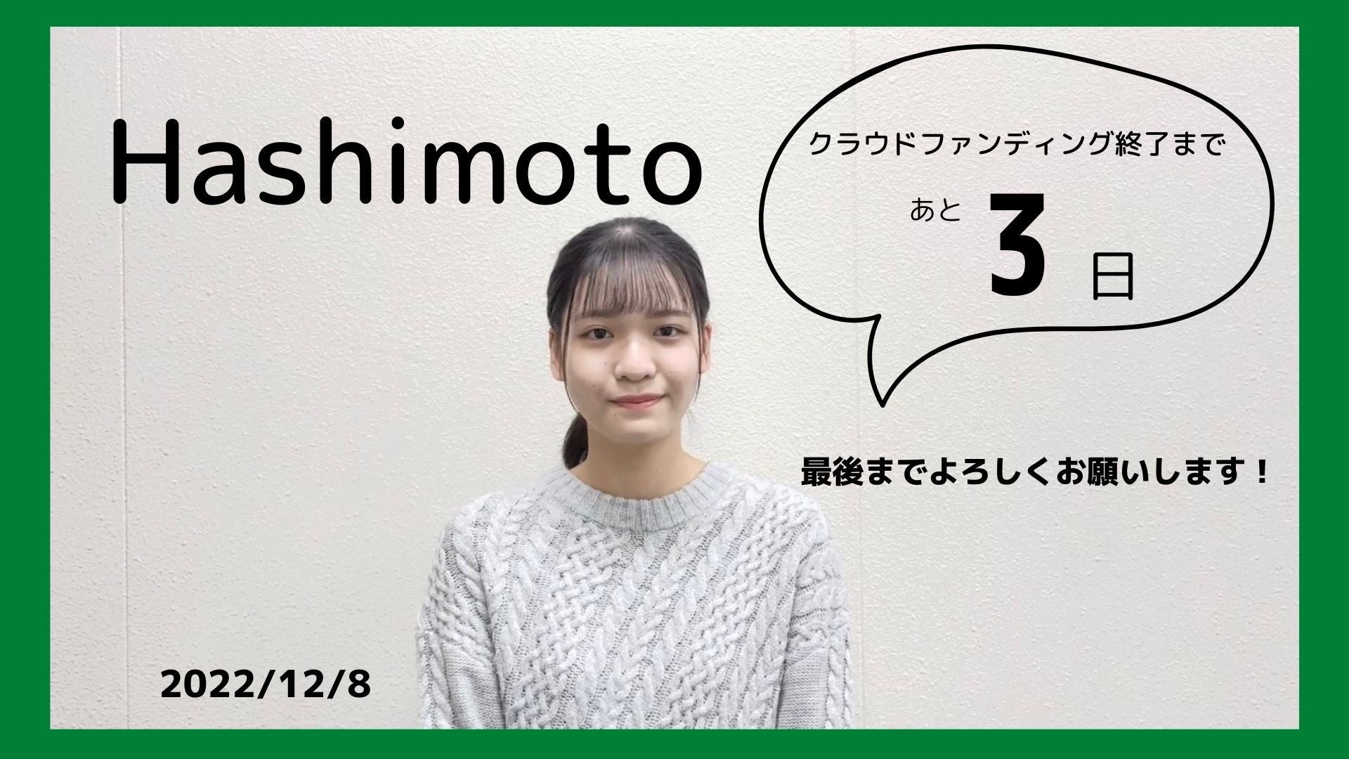 こんにちは!代表の辻です。本日はプロジェクト会計担当の”Hashimoto”です。ぜひご覧ください。クラウドファンディングはいよいよ今週日曜日までです!あと少し目標達成に向けて皆様のご協力お願いいたします。