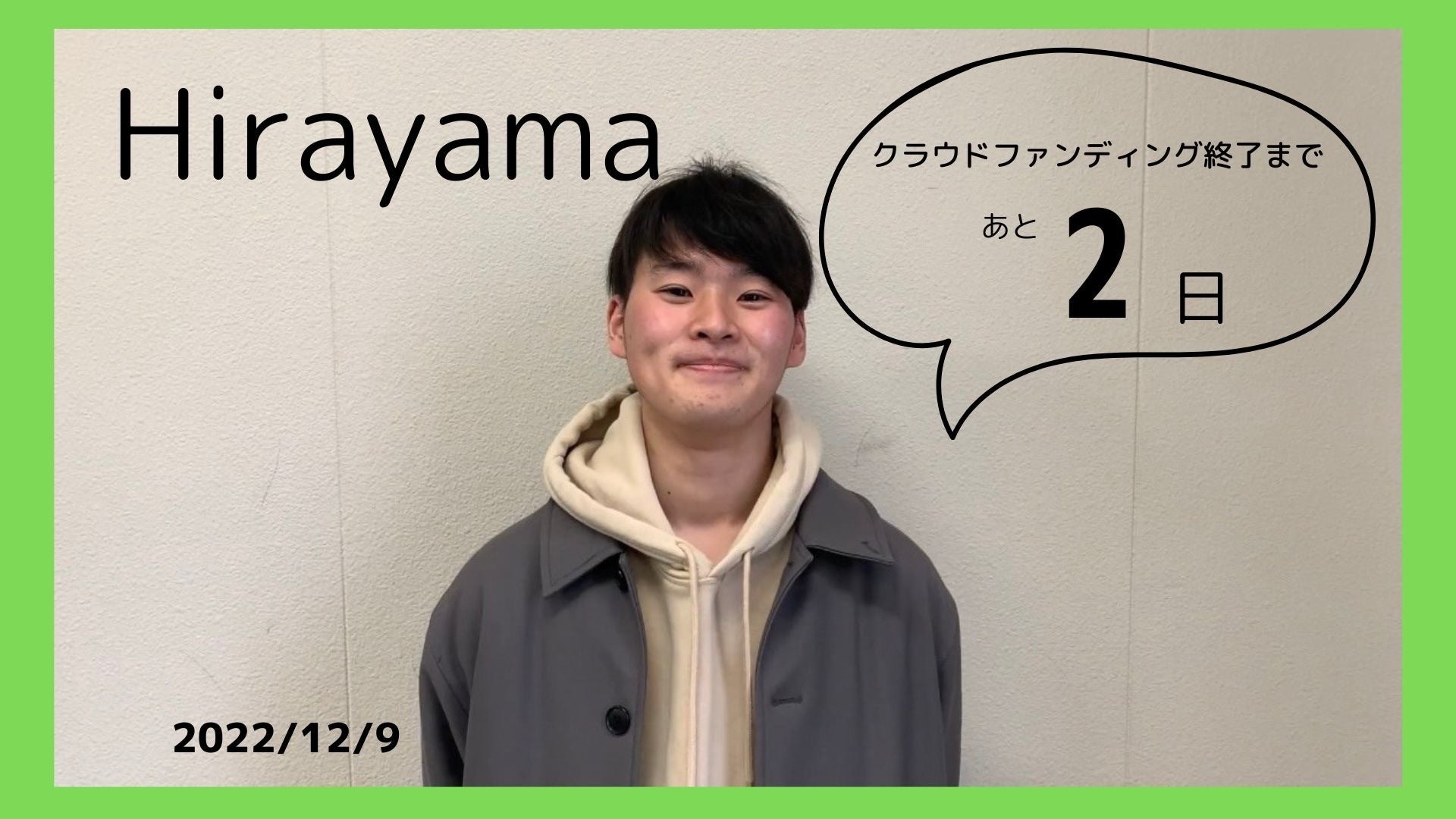 こんにちは!代表の辻です。本日はプロジェクト副代表の”Hirayama”です。ぜひご覧ください。皆様の支援により少しずつゴールに近づいてきています。あと二日、ぜひご協力お願いいたします!