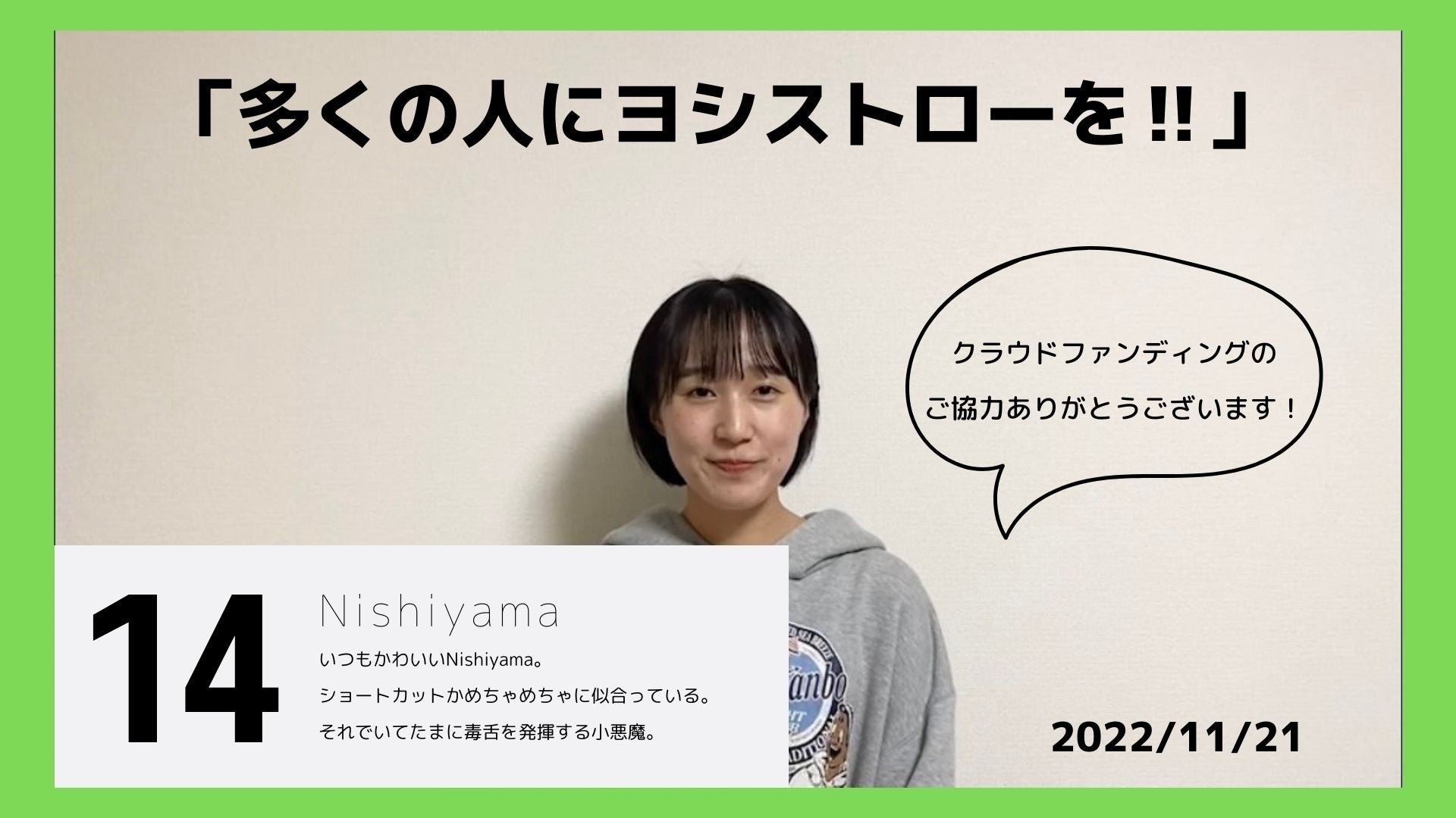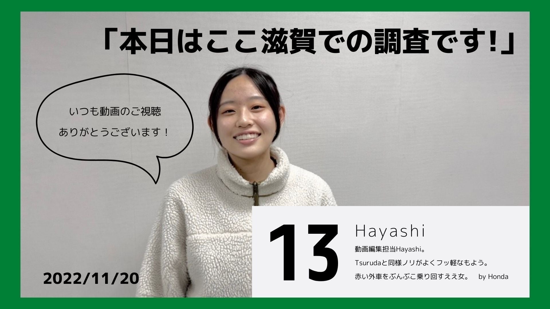 こんにちは!代表の辻です。本日はゼミ生の”Nishiyama”です。ぜひご覧ください。昨日、無事「ここ滋賀」での調査が終了いたしました!ご協力いただきました皆様、本当にありがとうございました。調査はこれで終了いたしますが、クラウドファンディングはまだ継続いたしますので引き続きよろしくお願いいたします。