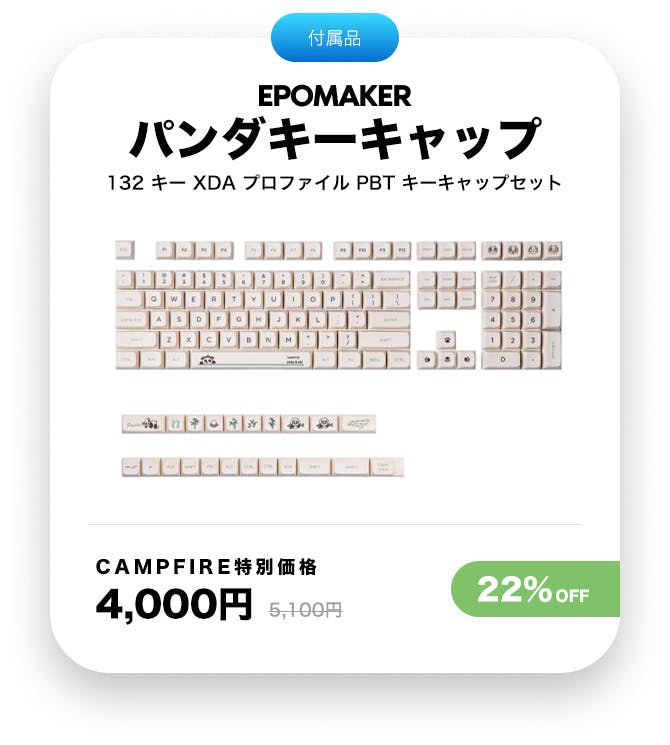 キャンペーンページのセオリ―キーキャップ版の画像では、テンキーに「END」と「Fn」の記号が表示されています。これは、写真のキーボードが試作品で、最終版ではないためです。実際には「+」と「-」の記号が使われます。この2つのキーの色は、画像のグレーではなく、テンキー上の他の数字キーと同じ色になります。この他にも、4種類のアイコンが付いたキーキャップが用意されています。