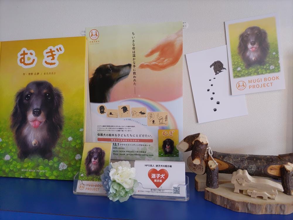 この話を周りの人にして話してみると子供たちは「保護犬」「繁殖犬」という言葉を聞いたことがないようでした。それなら、この本を 「"気づき” のきっかけ」にできないだろうかと考えました。犬との温かい交流の絵本から始まり、保護犬のことを子供たちにわかりやすく説明できないか。「保護犬を少しでも減らしたい」という ”きっかけの本” を作りたい。それをたくさんの子供たちに読んでもらいたい。子供たちが手に取れるように配布することはできないか。そんな思いで、MUGI BOOK PROJECTは活動しています。