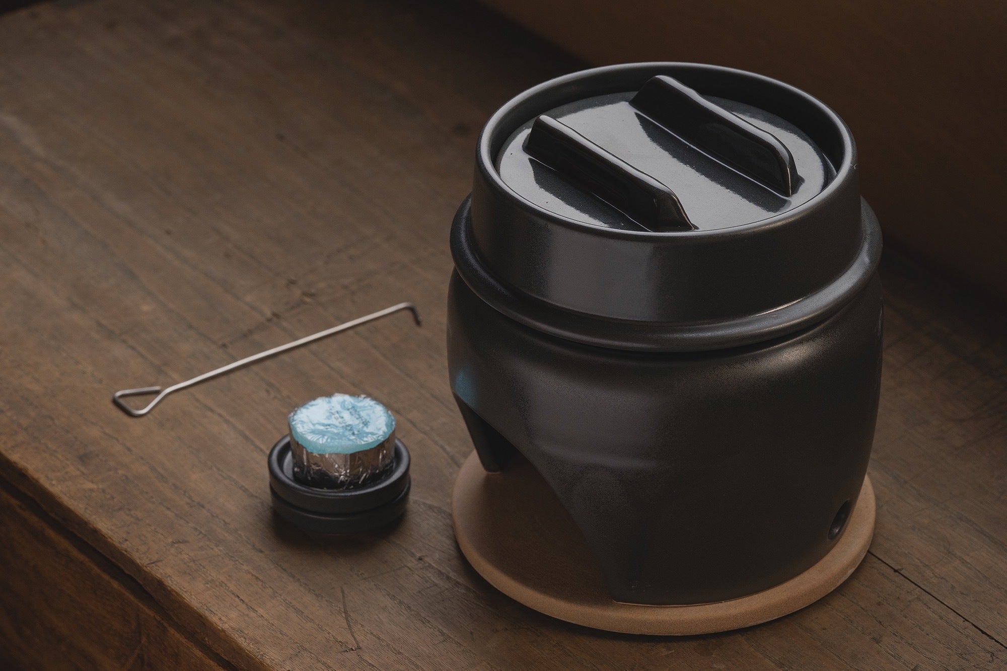 竈門付きのリターンに付属する鍋敷きには、陶器の焼き上げ時に使用する底板を採用。