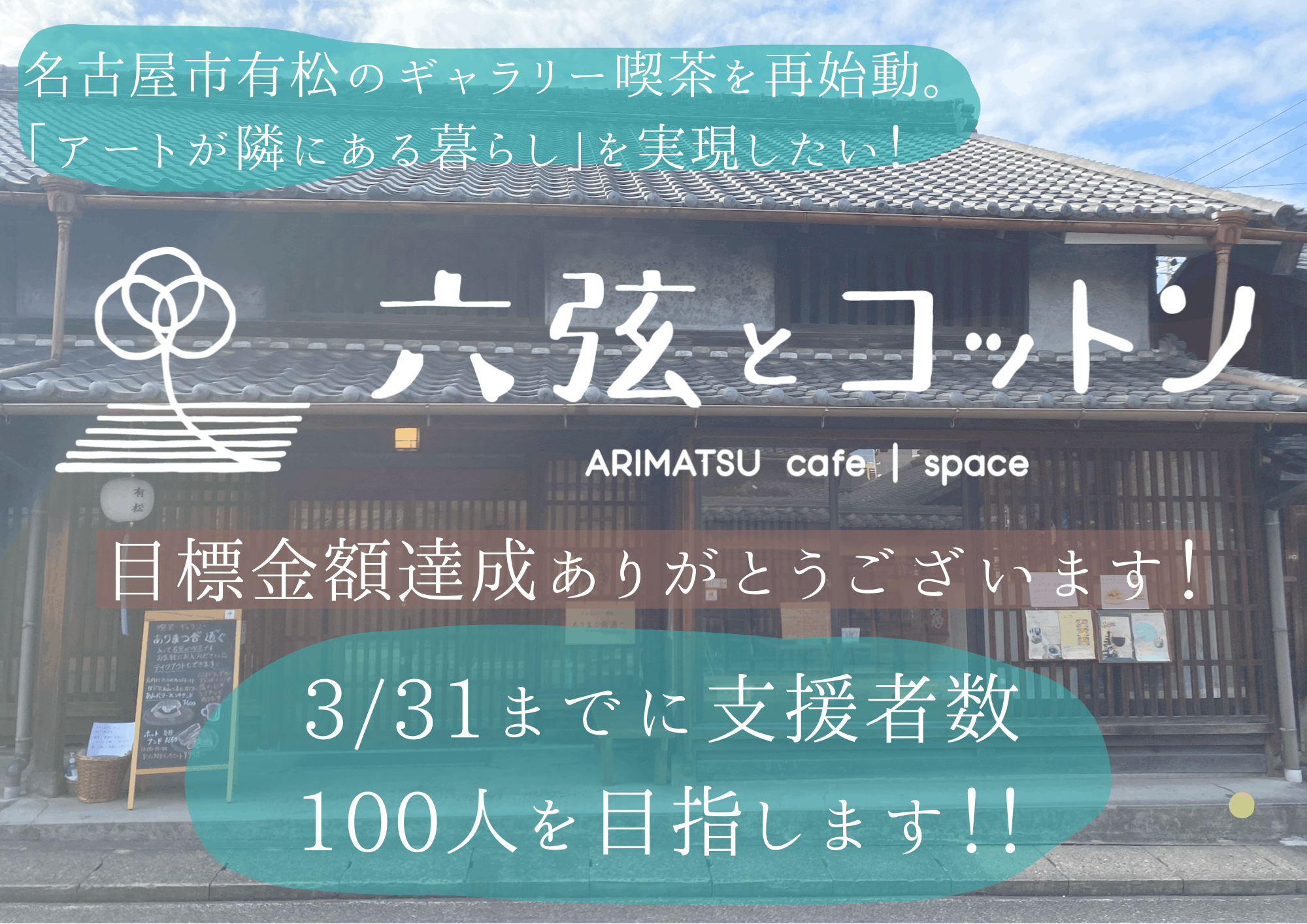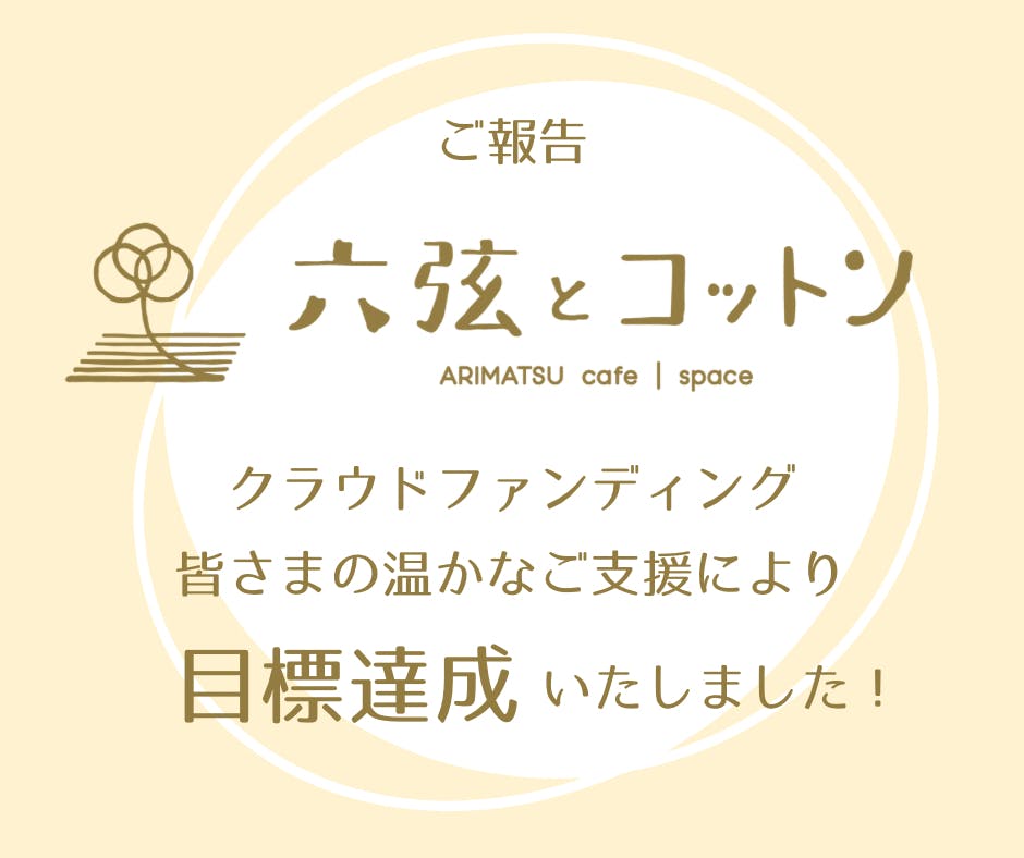 2023/03/18 08:00いつも応援頂いている皆さまへこの度、クラウドファンディングの目標金額である750,000円を123%(928,500円)で達成することが出来ました!本当にありがとうございます!!急展開で驚きもありましたが、何より活動を見守って頂き、お気持ちを頂けることのありがたさと幸せを噛み締めています。心より感謝申し上げます。皆さまのご支援のおかげで『ARIMATSU cafe|space 六弦とコットン』は走りだすことができます。お気持ちにお応えできるよう、これからも一生懸命運営に努めてまいります!そして、クラウドファンディングの期間は今月末3月31日までとなります。残り13日、我儘を承知ではありますが引き続き皆さまのご支援を募らせて頂きます。4月からの運営に向けた準備も本格化し、ここから真の意味でスタートとなっていきます。更なる応援を何卒よろしくお願い致します!改めて、本当にありがとうございました! もっと見る