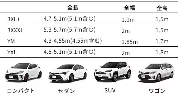 ・横幅あるいは高さが表の数値通りでなくても問題ありません。横幅と高さは補完されるため、合計値でご検討ください。(例:長さは4.8m、横幅は1.8m、高さは1.6mの場合にも3XL+を利用できます。)