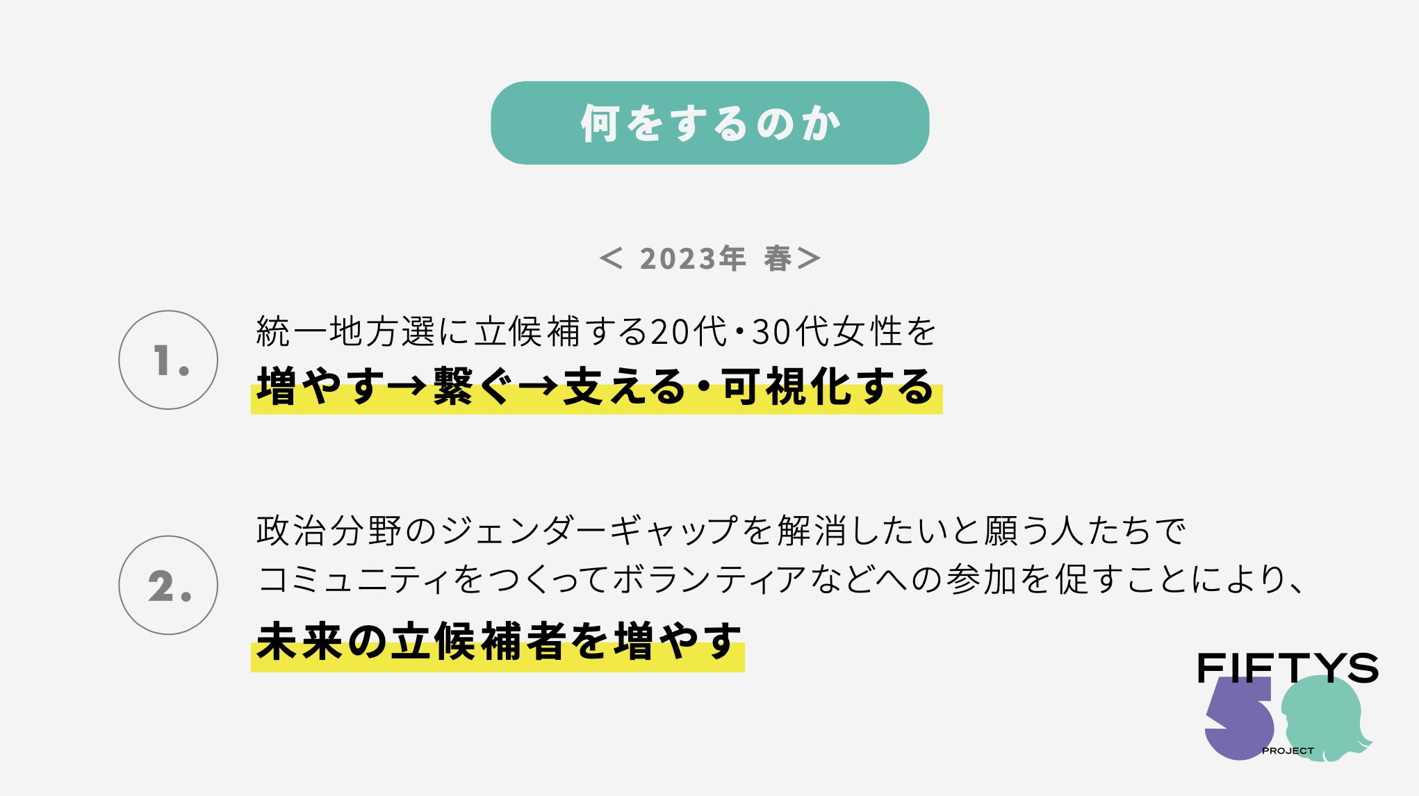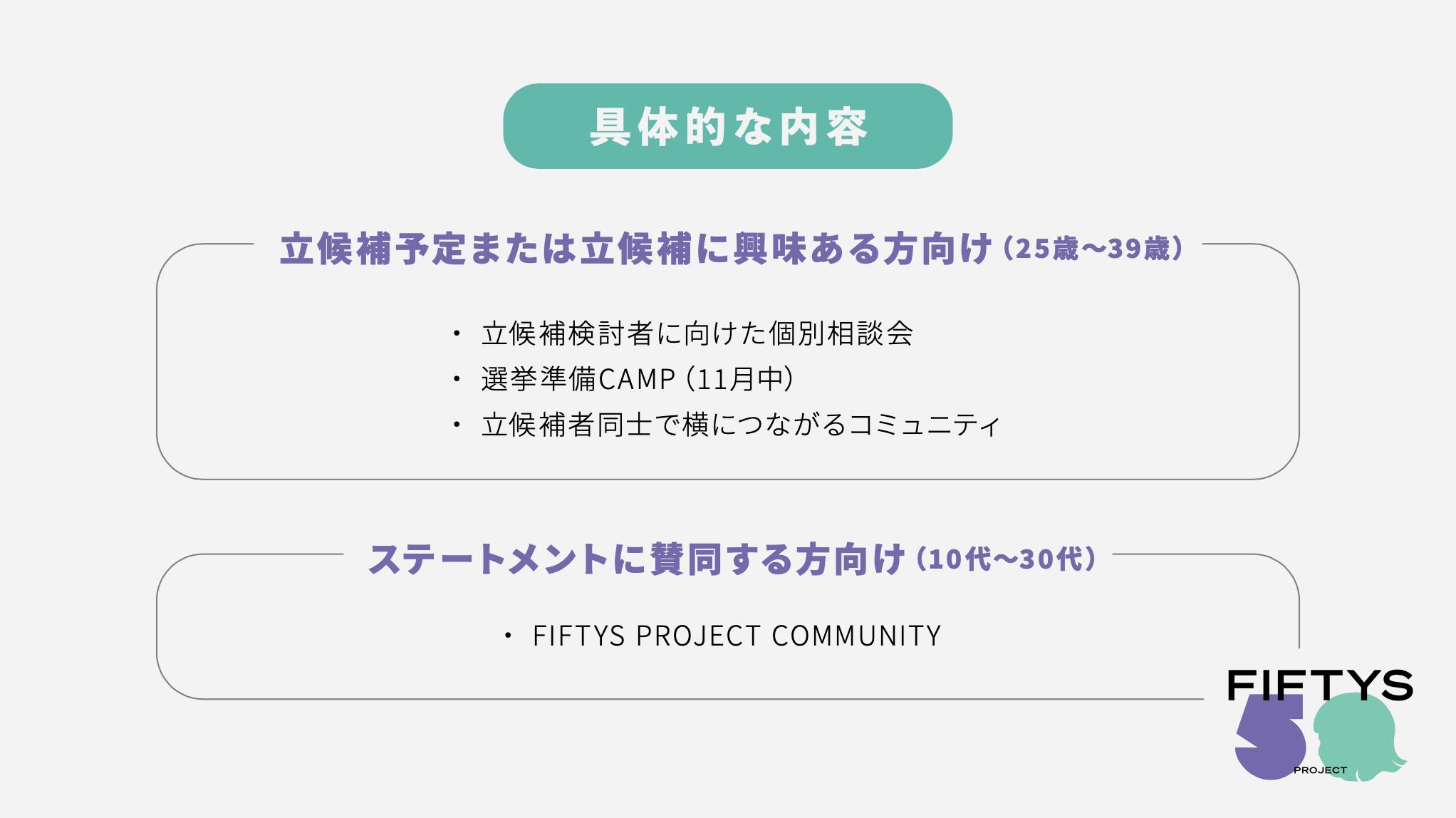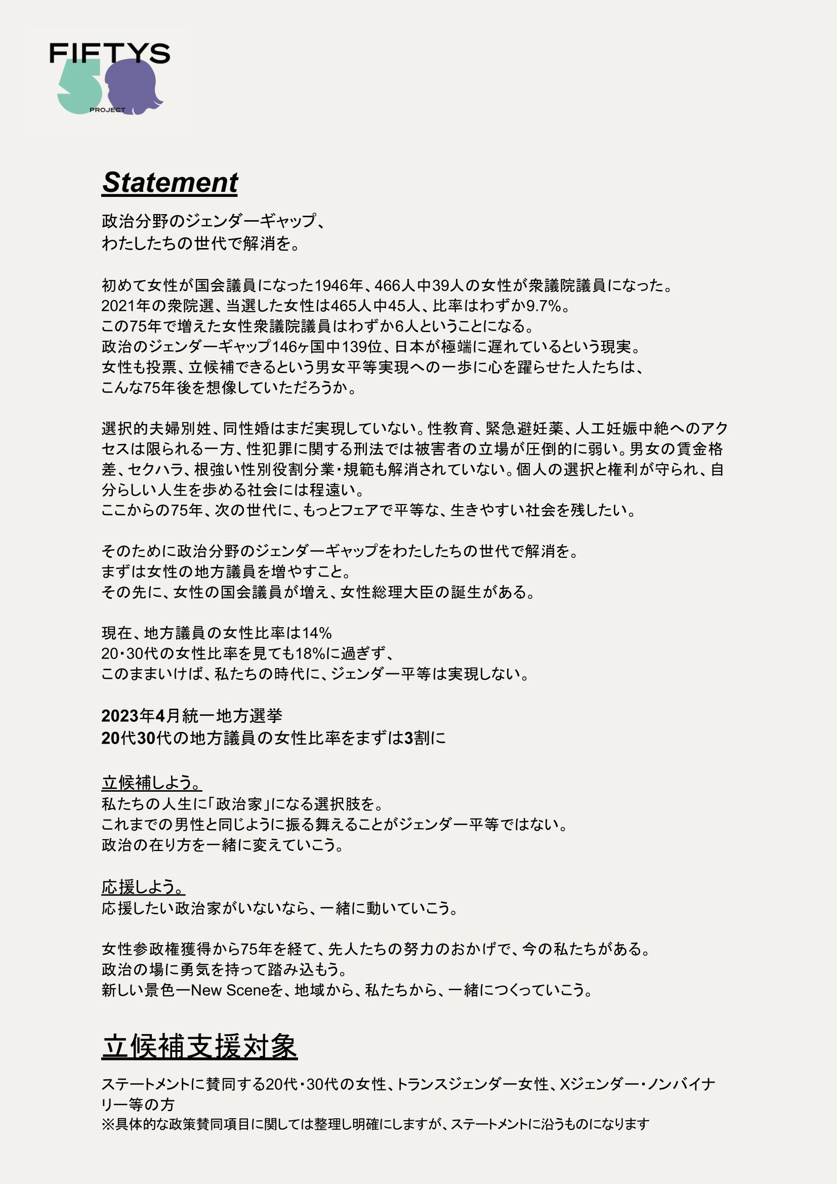 こんにちは、FIFTYS PROJECTです。私たちは政治分野のジェンダー不平等の解消を目指し、2023年4月統一地方選に向けて20代、30代の女性や多様なジェンダーアイデンティティを持つ地方議員を増やすことを目的に活動を始めます。