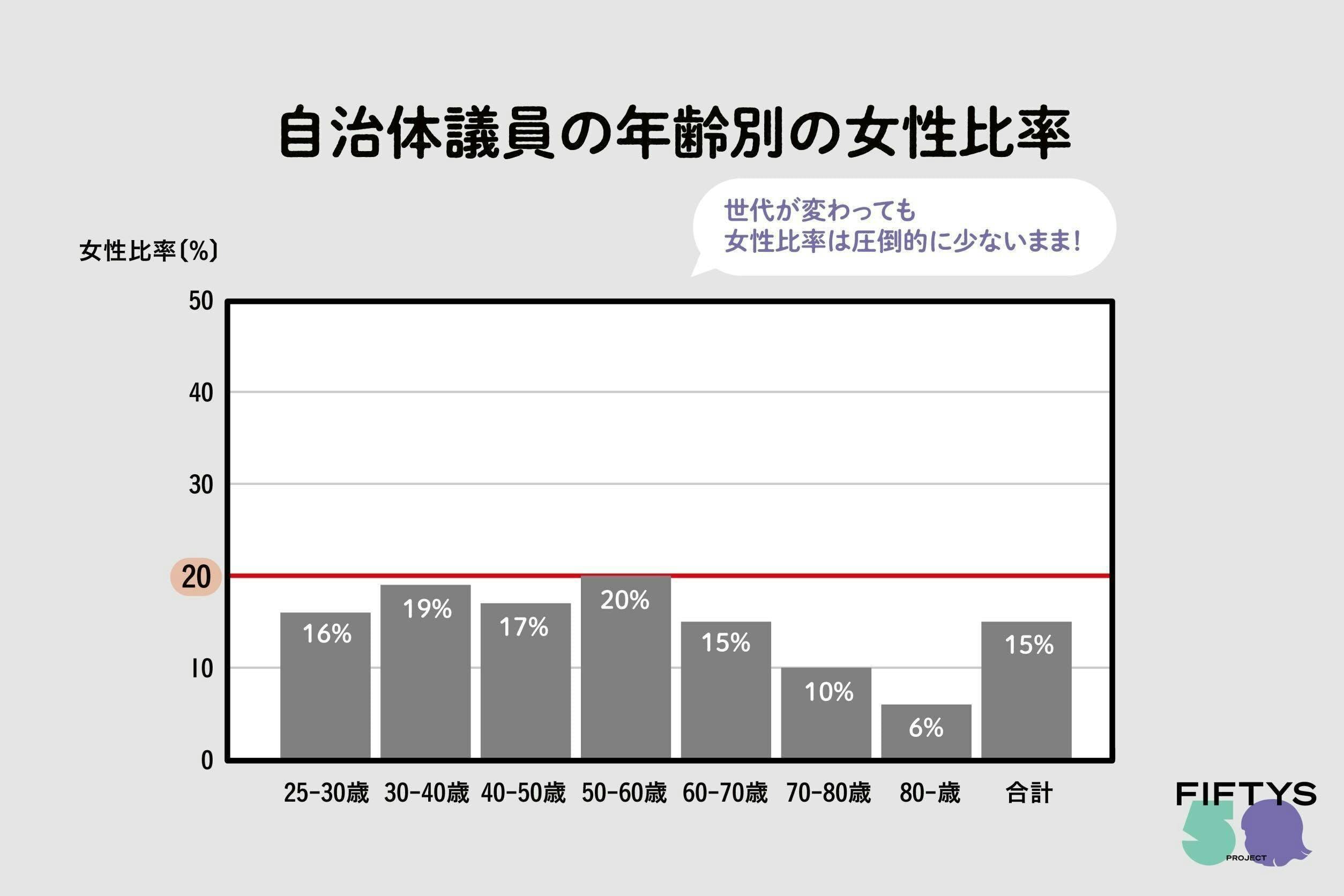 この傾向は国会議員に限ったことではありません。経験を積むため、政治的なバックグラウンドを持たない場合には特に重要となる自治体議員の女性比率。年齢別に見てみても、ジェンダー平等は達成していると思われがちな20代30代の女性比率はそれぞれ16%, 19%に過ぎません。