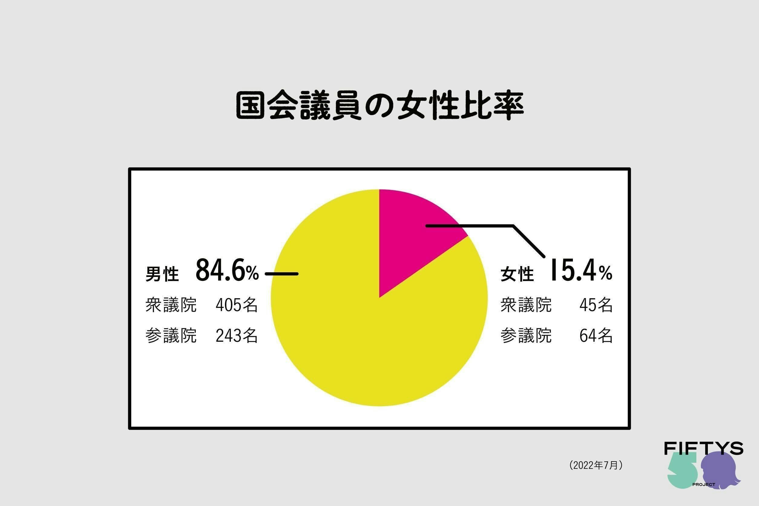 しかし長期的視点で現状を振り返ると、課題は山積しています。特に政治分野におけるジェンダー不平等は、2022年ジェンダーギャップ指数でも146ヵ国中139位と深刻です。衆議院45名、 参議院64名であわせて女性議員は全体の15.4%と、議会の意思決定の場に常に女性は少ないまま、クリティカルマス(少数派の意見が可視化される数値)と言われる3割にも達しない状態が続いています。