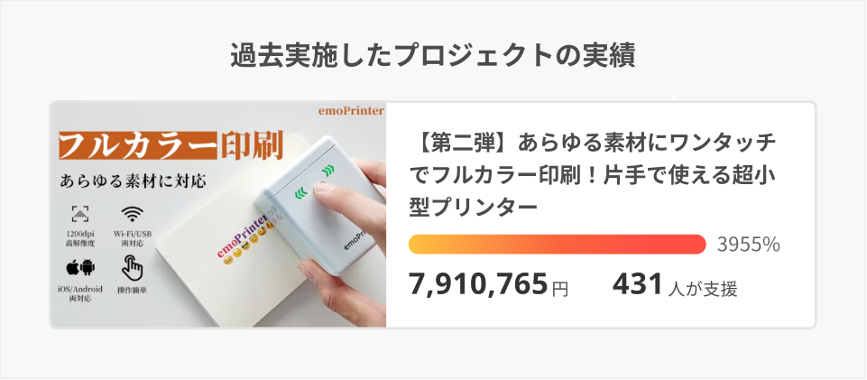 クラウドファンディングによって集まった資金はCAMPFIRE手数料を除き、「emoPrinter 」の商品仕入れ、販促、支援者の皆様への配送の費用などに使用させていただきます。
