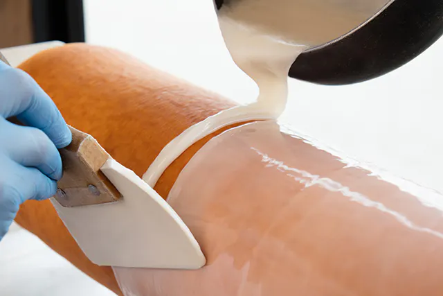 バウムクーヘンの食感をしっとりさせるために配合と生地の硬さに気を配っています。