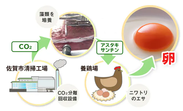 そこで佐賀市の協力のもと、このCO2をエサにした藻を鶏に食べさせてみてはどうかというアドバイスにより、当鶏舎に協力依頼がきたのです。